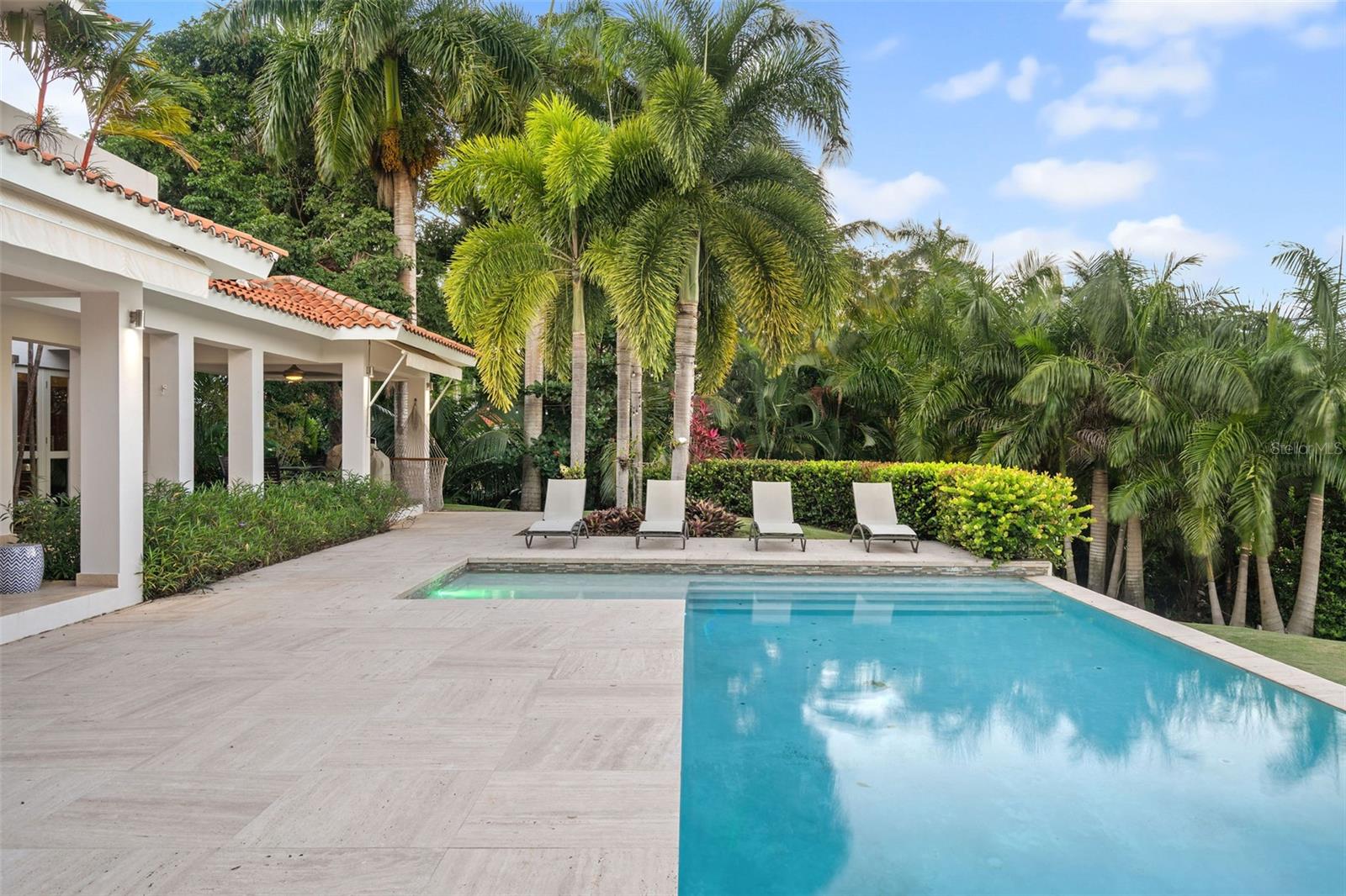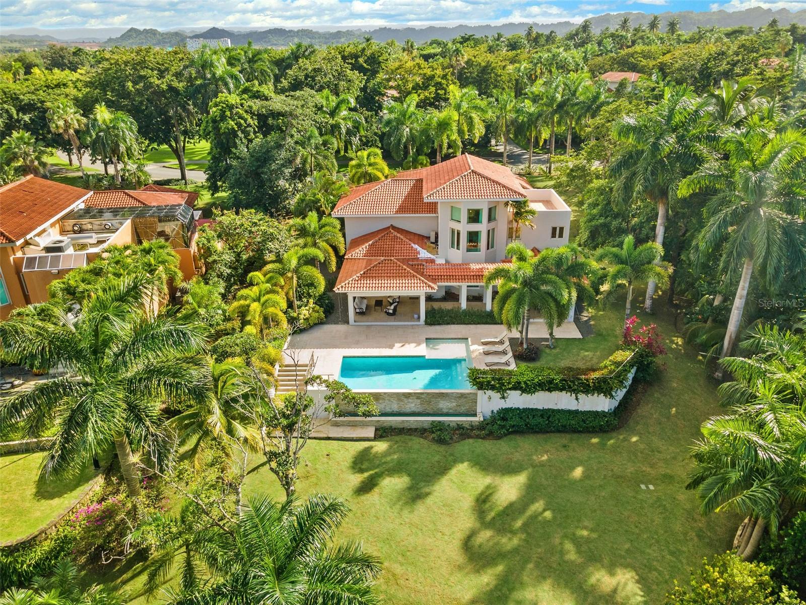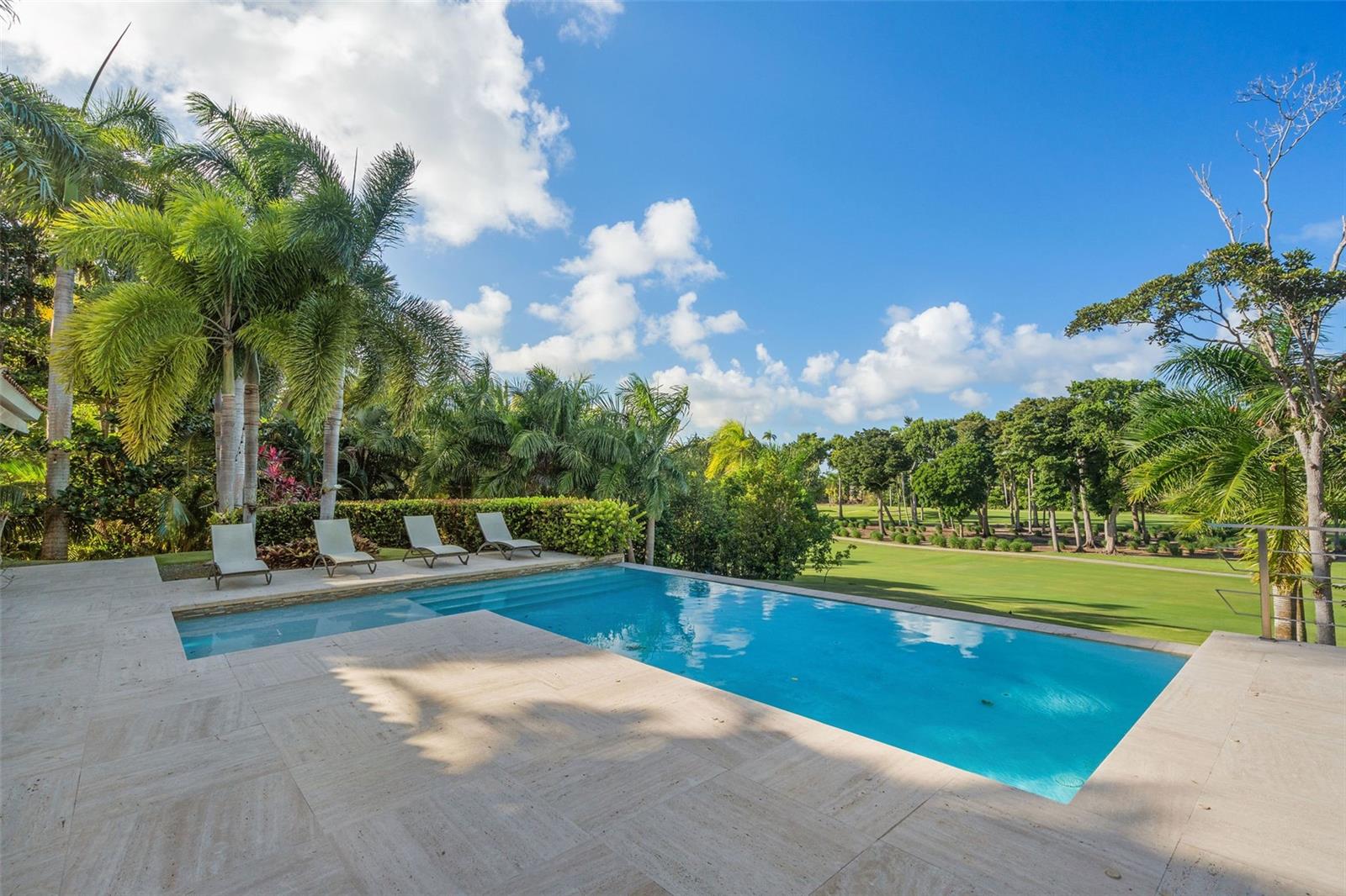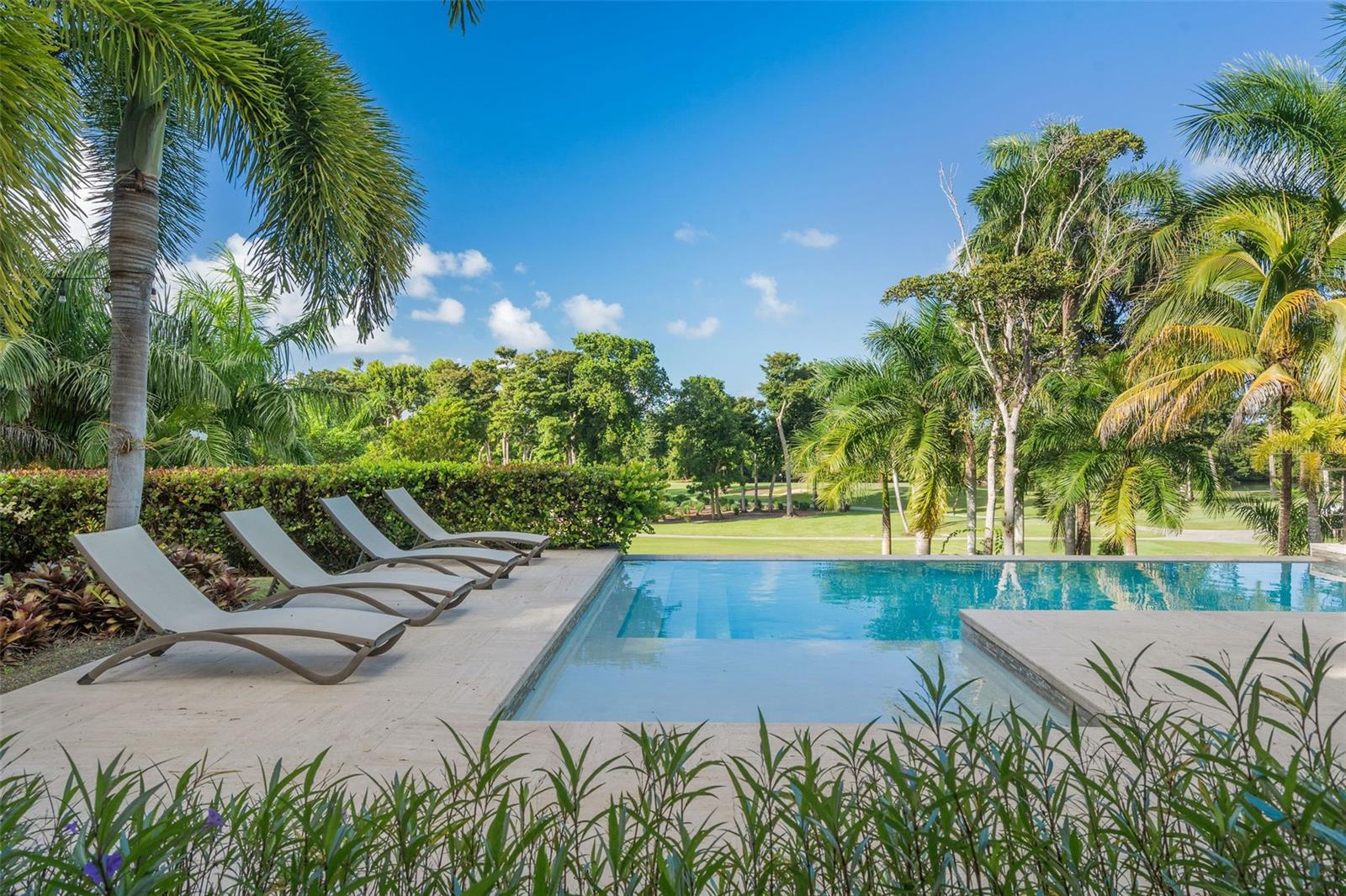 This sun-drenched and spacious property has 5 bedrooms, 6.5 bathrooms over 6,000 sq. ft. and sits within a lush and tropical community. The open and contemporary property boasts cathedral ceilings, tiled floors throughout, a dream kitchen with all high-end appliances and a secluded, fully-furnished outdoor patio/backyard. Large Infinity Pool overlooking the East Golf Course