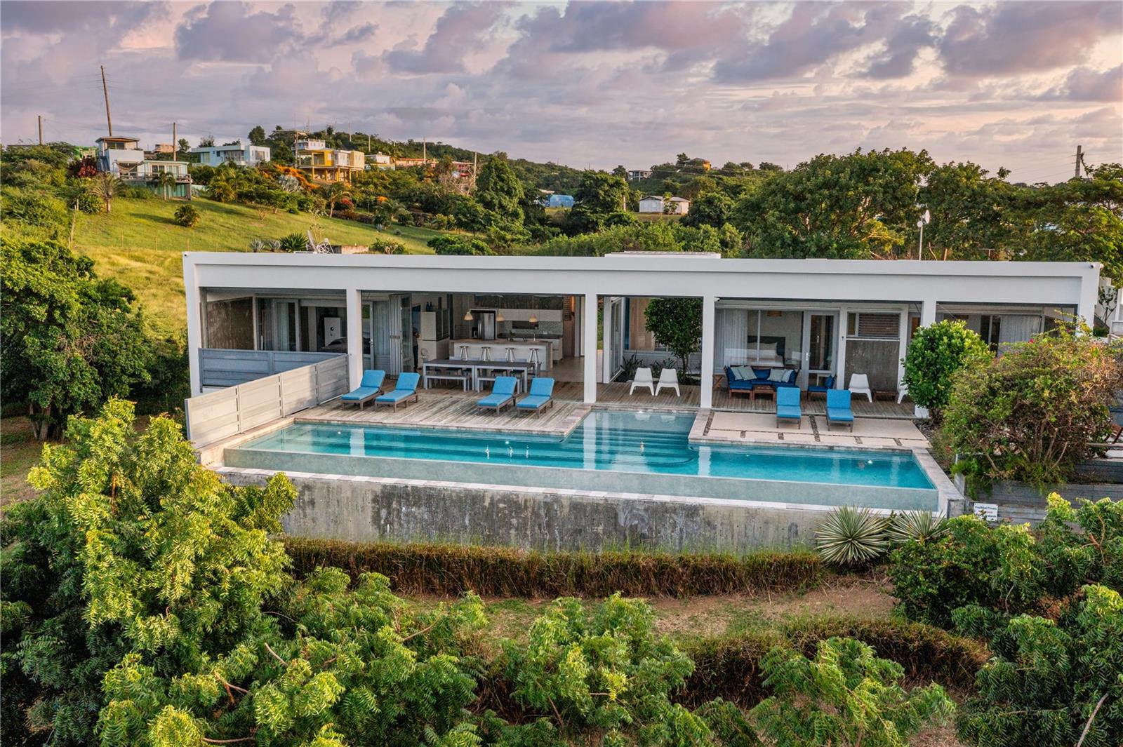 Designed with meticulous attention to detail, Casa Blue harmoniously blends modern luxury with mid-century charm. The spacious living areas are adorned with sleek lines, large windows and doors, and vibrant accents, creating an inviting atmosphere that seamlessly connects with the tropical surroundings and sea views.