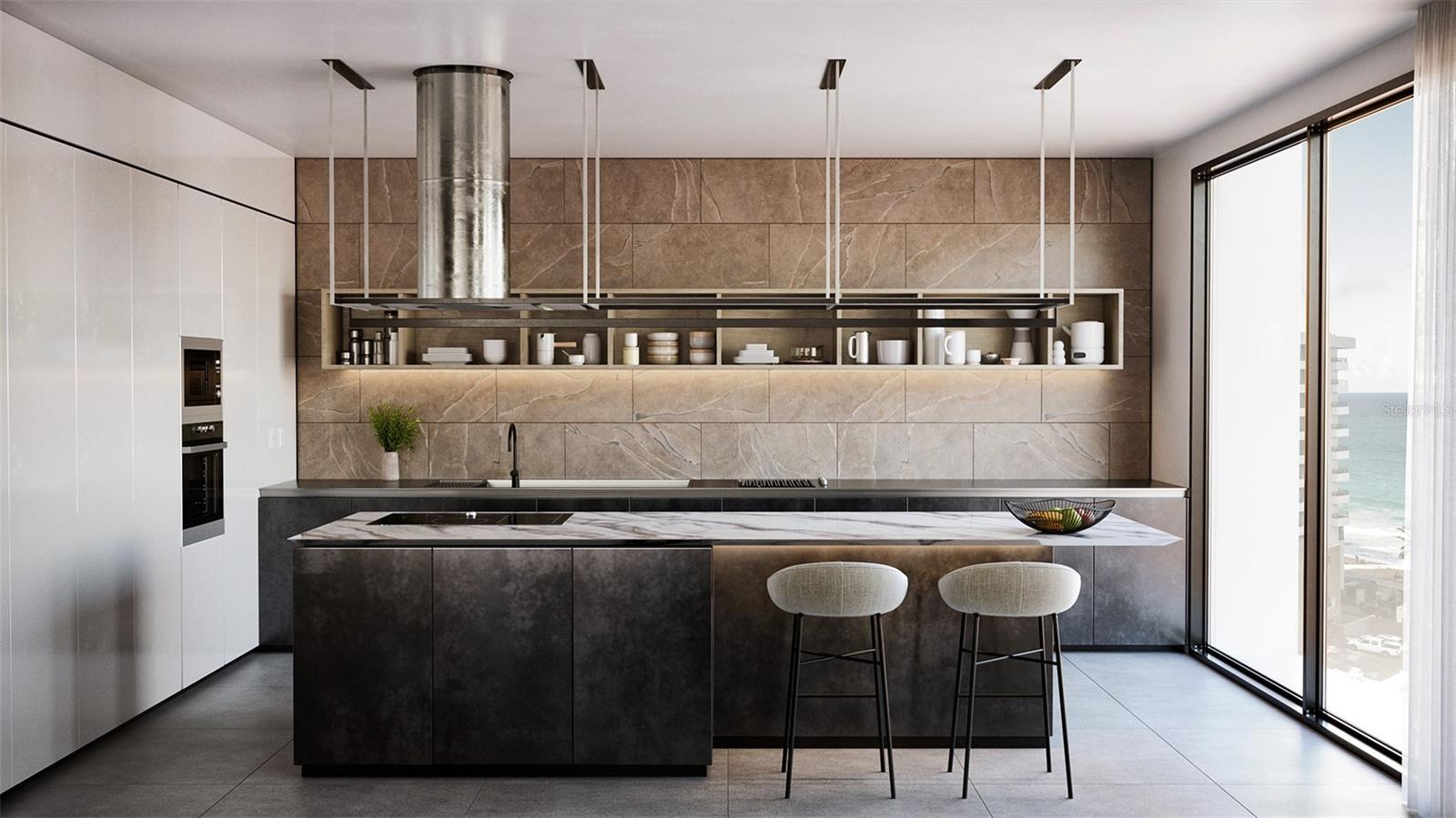 The gourmet kitchen is custom designed by Italian luxury brand, Boffi, featuring quartzite countertops, an oversized island, and is fully equipped with luxurious Sub-Zero and Wolf appliances that include a fully integrated refrigerator and freezer, five-burner cooktop, integrated dishwasher, wall oven, and wine refrigerator.