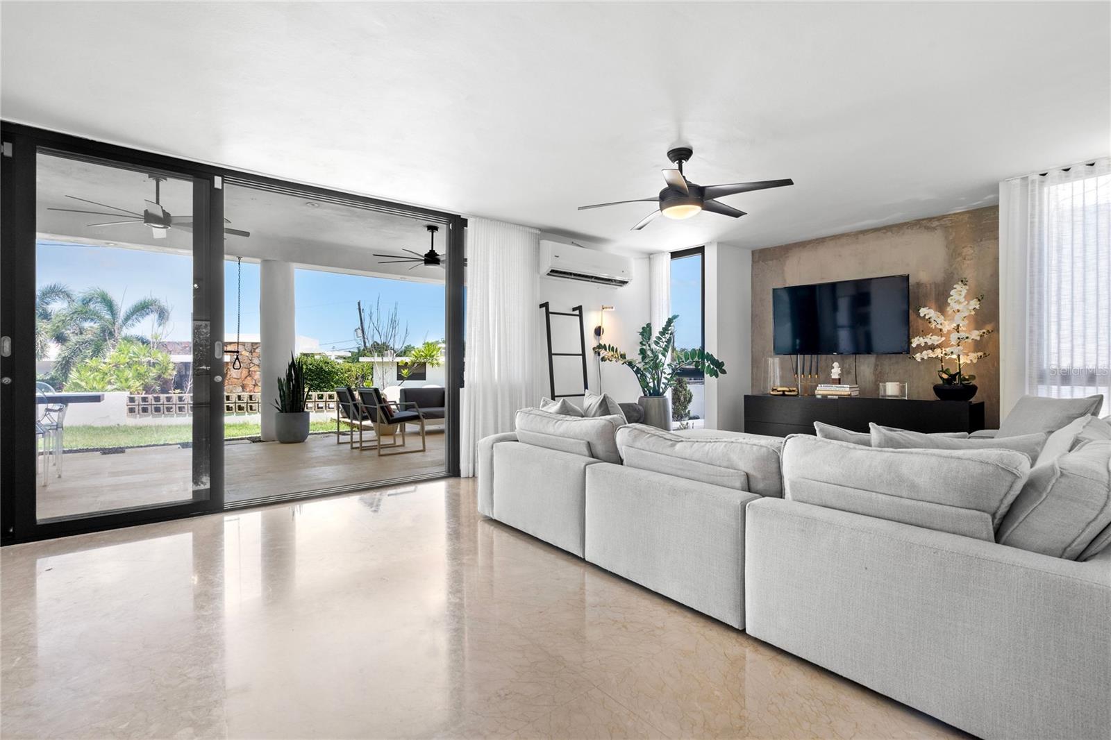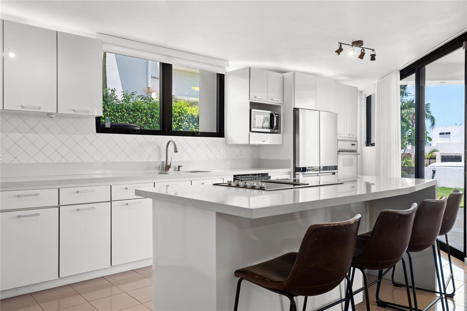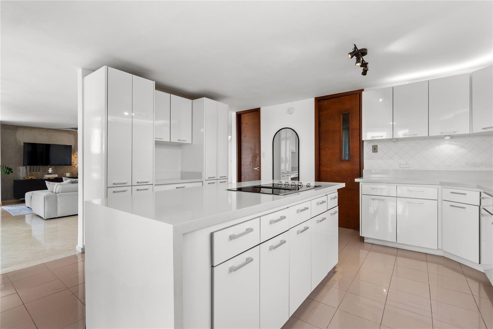 The heart of the home is the expansive kitchen, featuring stainless steel appliances, sleek quartz countertops, and a large island with a cook top, additional prep space, and seating. With ample counter space and custom cabinetry, the kitchen combines both style and functionality. This bright and airy kitchen is perfect for everyday meals and special gatherings, connecting smoothly to the outdoor covered terrace and salted water pool. The outdoor space is a true entertainer's dream, complimented by a pool deck and lounge area.