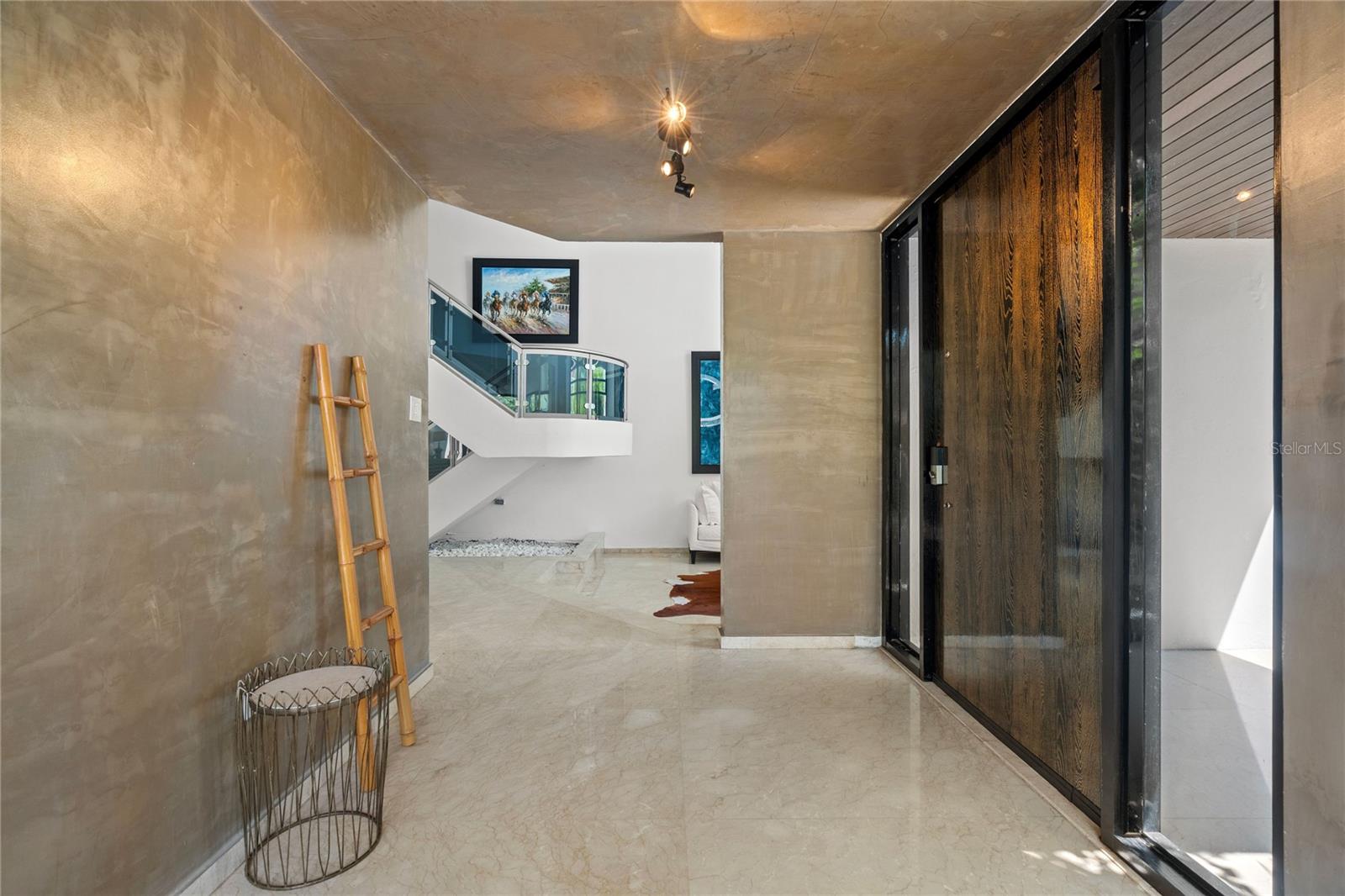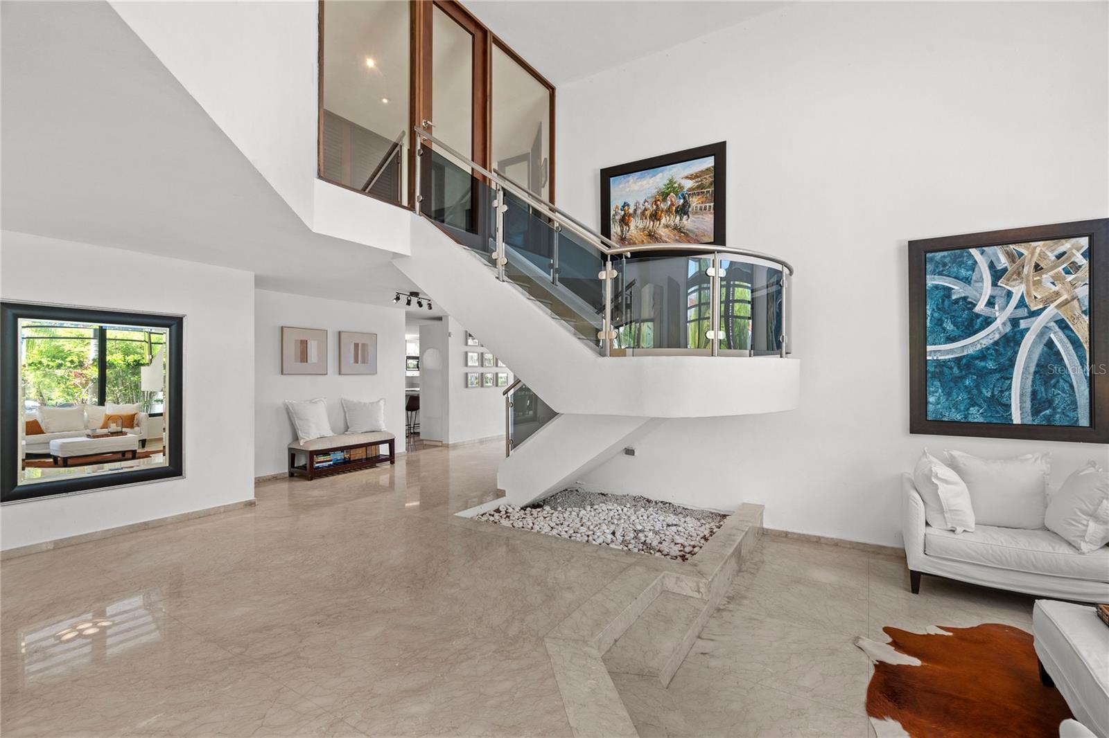 Upon entering, the grand main doors open to reveal a remarkable modern staircase with steel railings and glass panels, allowing natural light to flow effortlessly to the multiple floors of the home High ceilings and oversized windows enhance the spaciousness, while marble floors add a touch of sophistication. The open-concept design seamlessly connects the living, dining, and family areas, creating a harmonious flow.