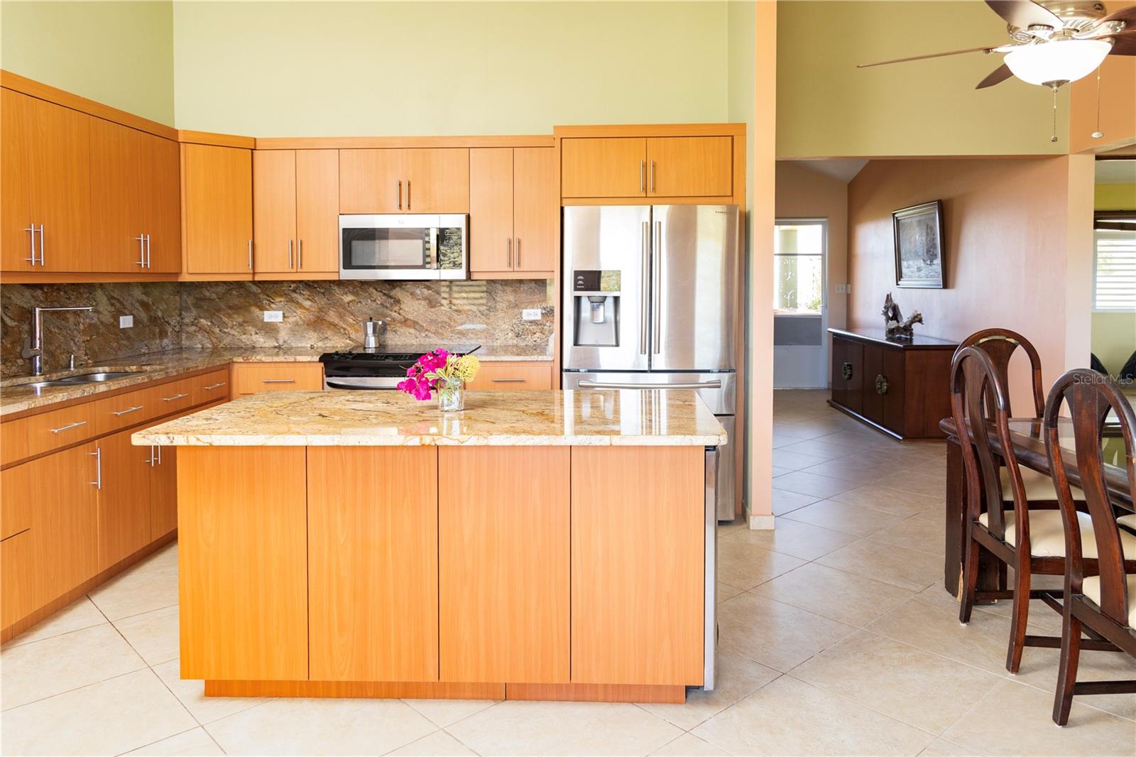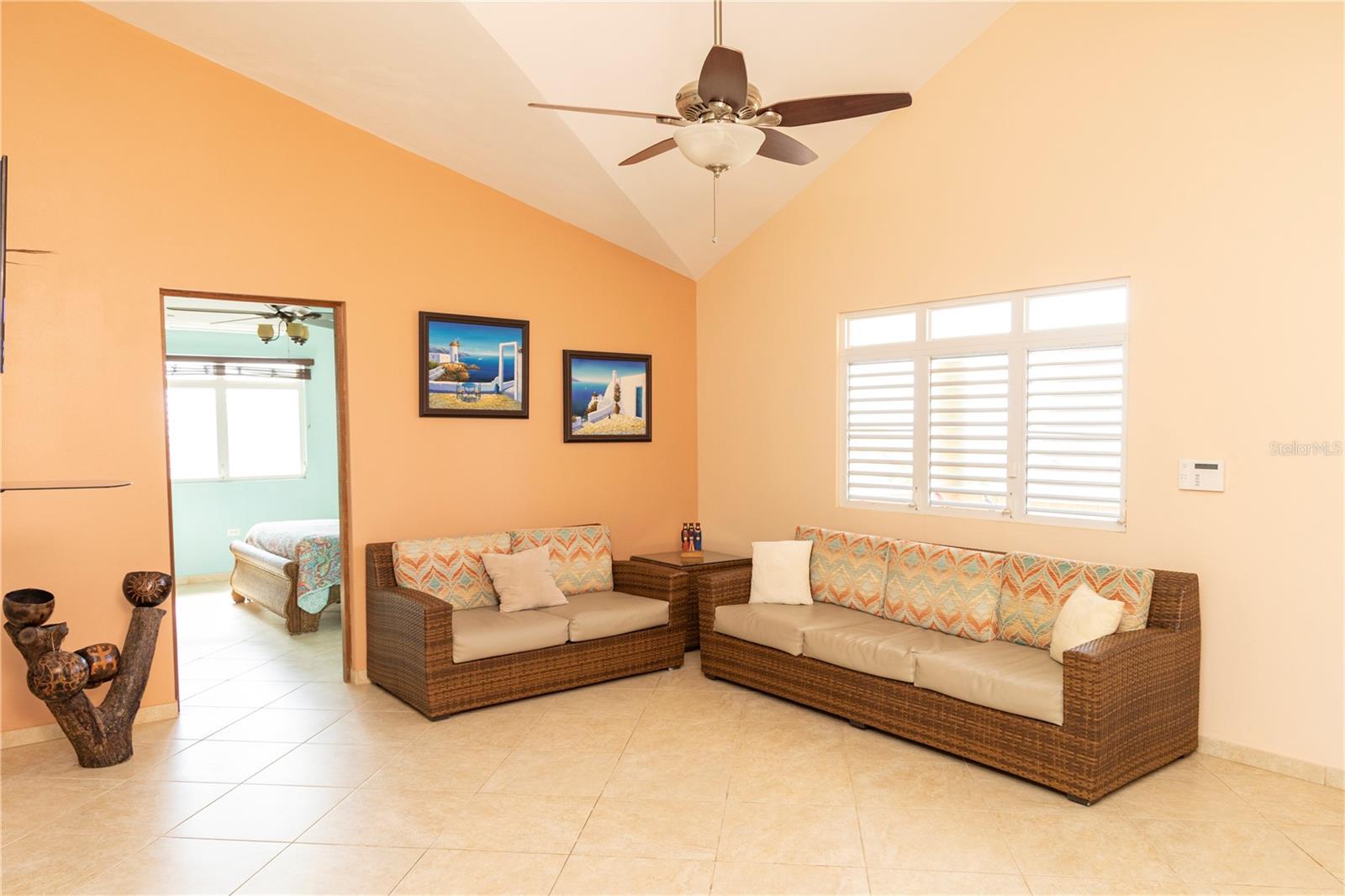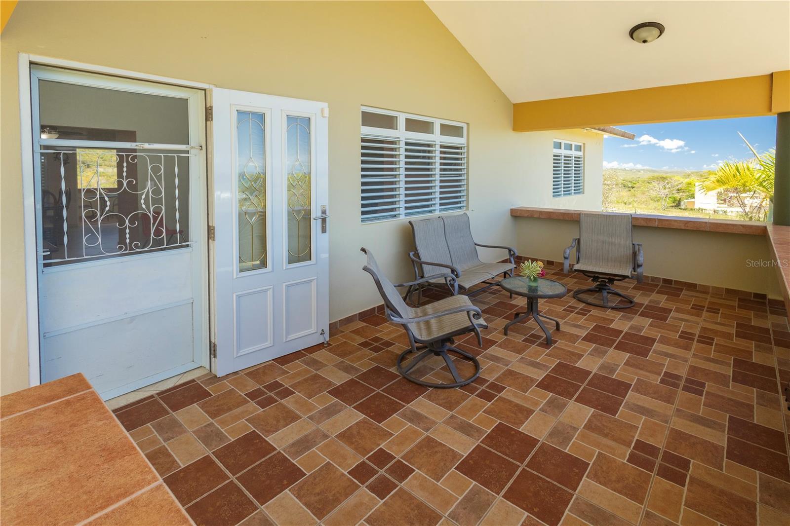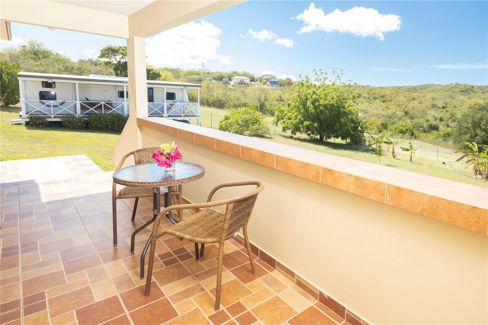 From its grand entrance in the bucolic neighborhood of Puerto Real to its vaulted interiors, this family owned residence has a stately appearance. The elegant home is set back on a hilltop and surrounded by cool trade winds, majestic views of the Caribbean, and tranquil rolling hills and meadows. The property has 1.6 acres of privacy, the land is scattered with a myriad of fruit trees, including breadfruit, mango, pigeon peas, soursop, gooseberry, lemon, and a variety of plantains and bananas.