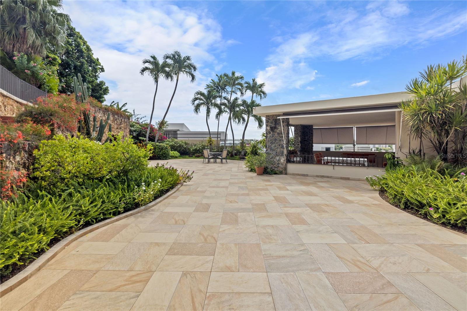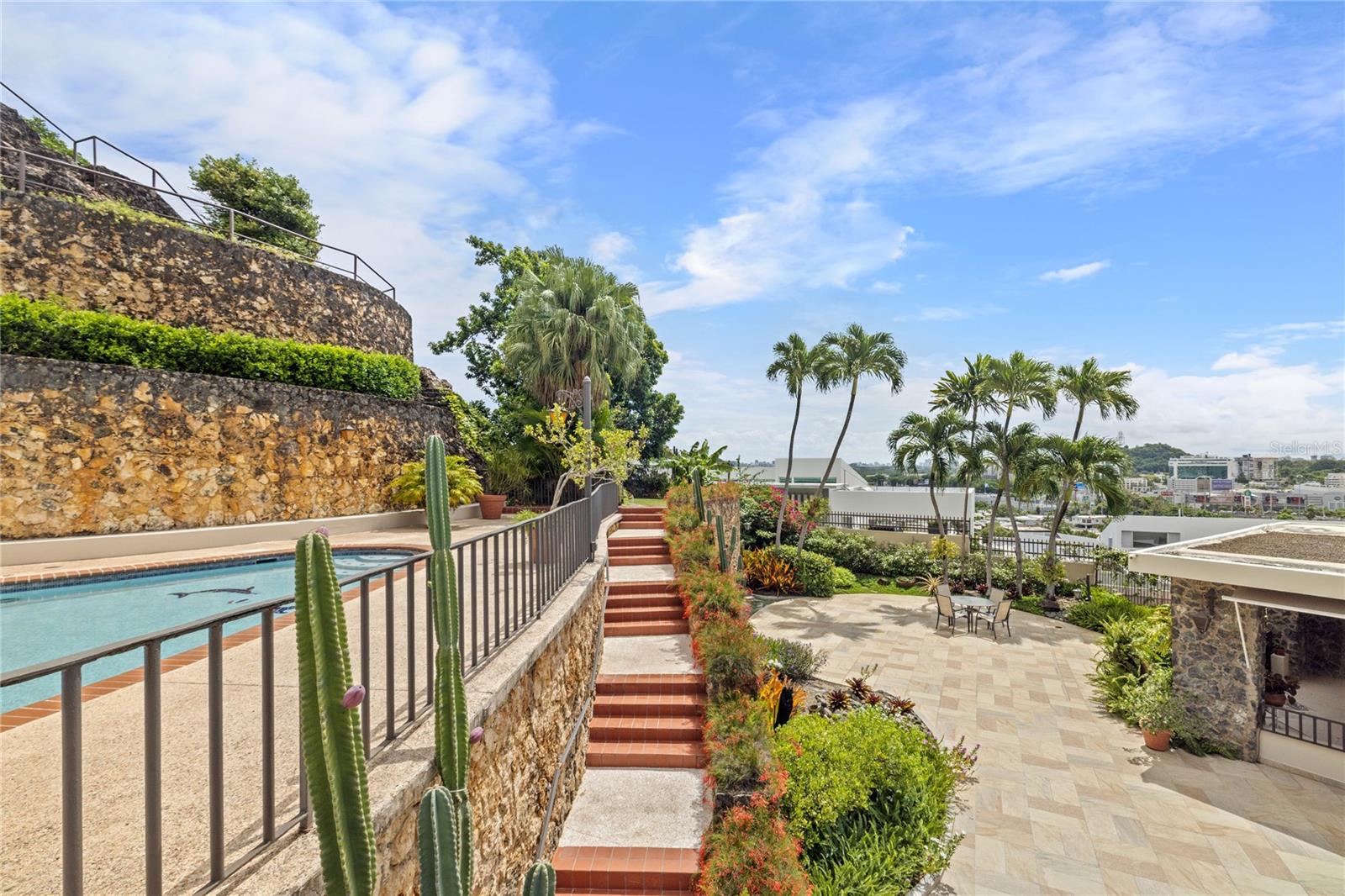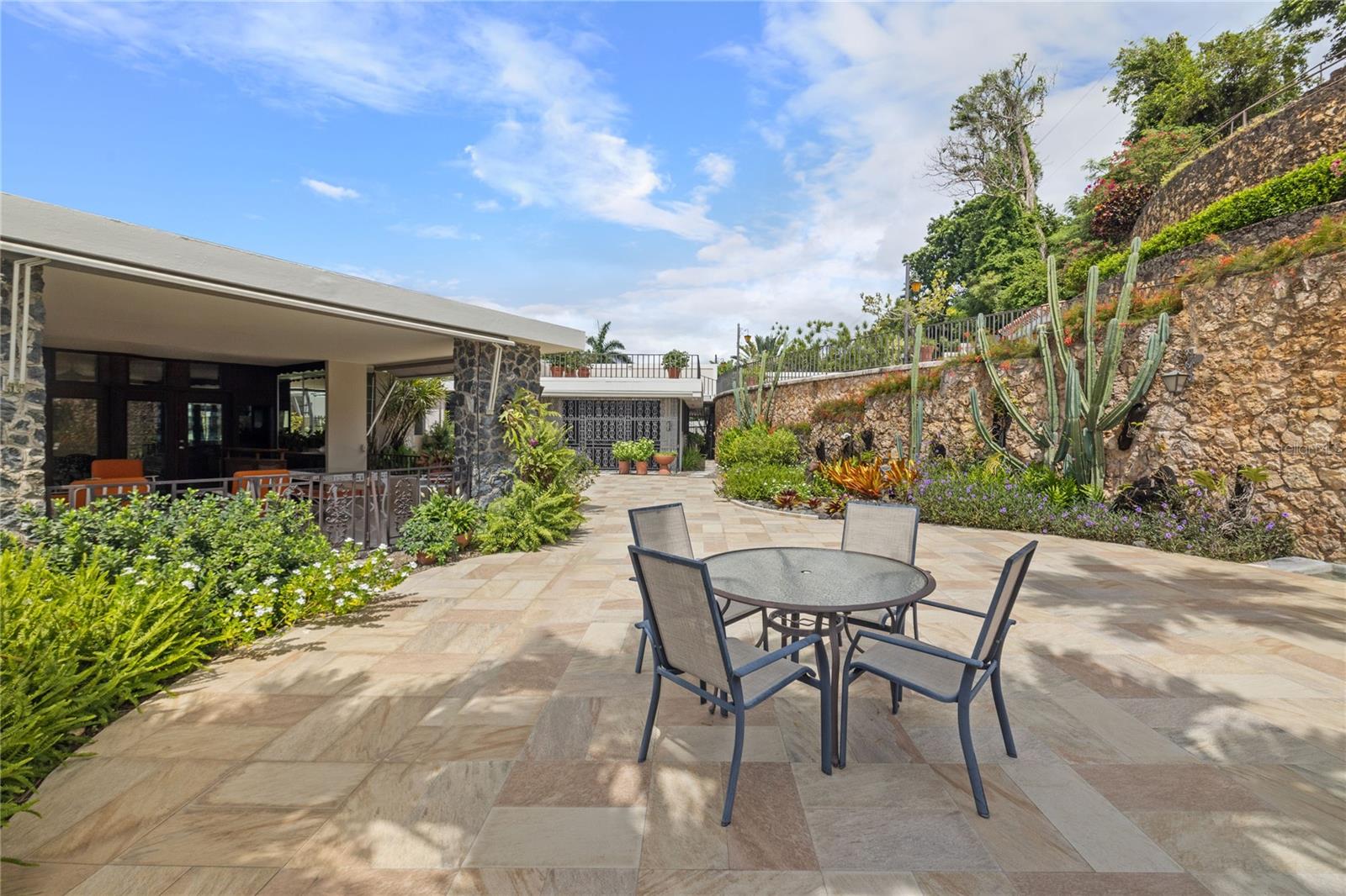 Inside, the home boasts pristine terrazzo floors with bronze inlays, high ceilings, and large windows that bathe the space in natural light. The spacious kitchen offers a view of the patio and is accompanied by a separate laundry room and maid’s quarters. Among the seven bedrooms and six bathrooms, a separate level includes a bedroom that could serve as a guest room, plus an office.