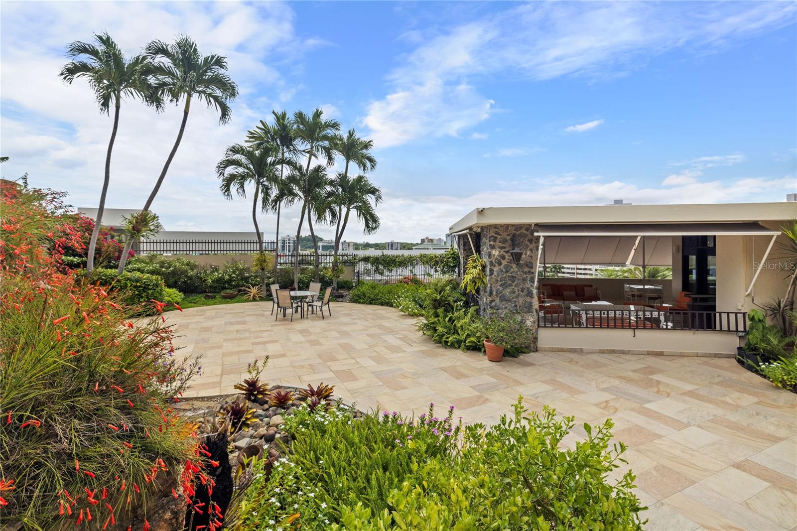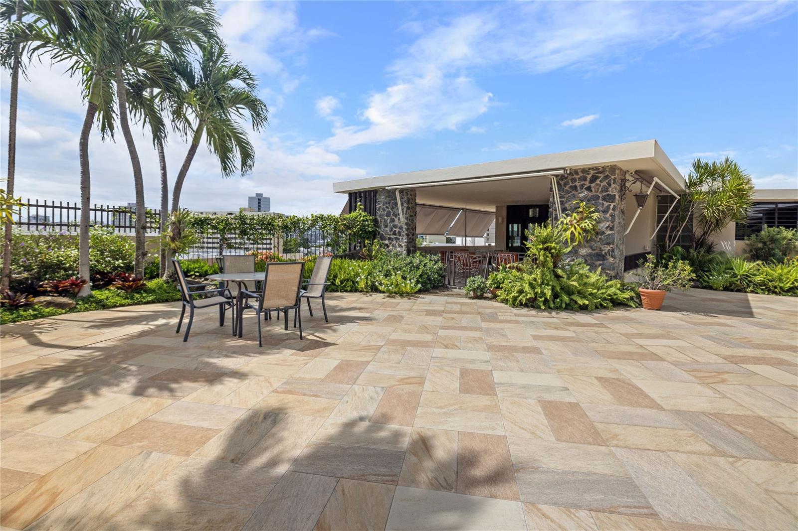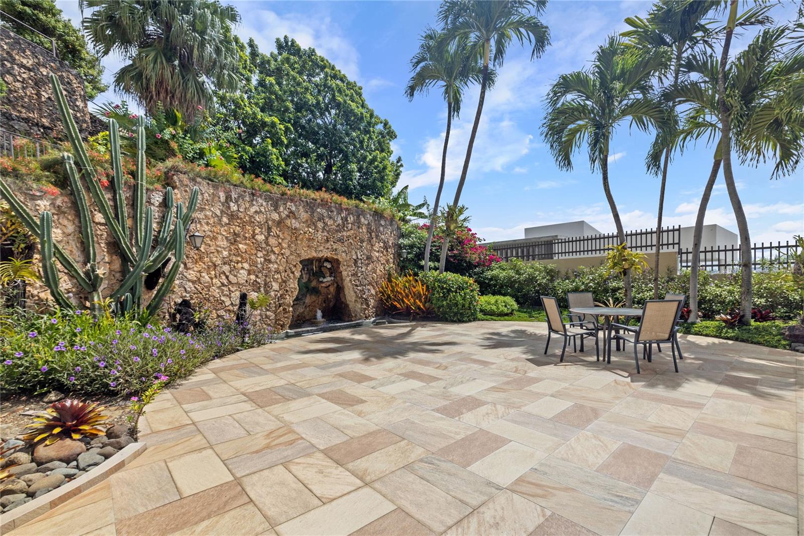 Inside, the home boasts pristine terrazzo floors with bronze inlays, high ceilings, and large windows that bathe the space in natural light. The spacious kitchen offers a view of the patio and is accompanied by a separate laundry room and maid’s quarters. Among the seven bedrooms and six bathrooms, a separate level includes a bedroom that could serve as a guest room, plus an office.