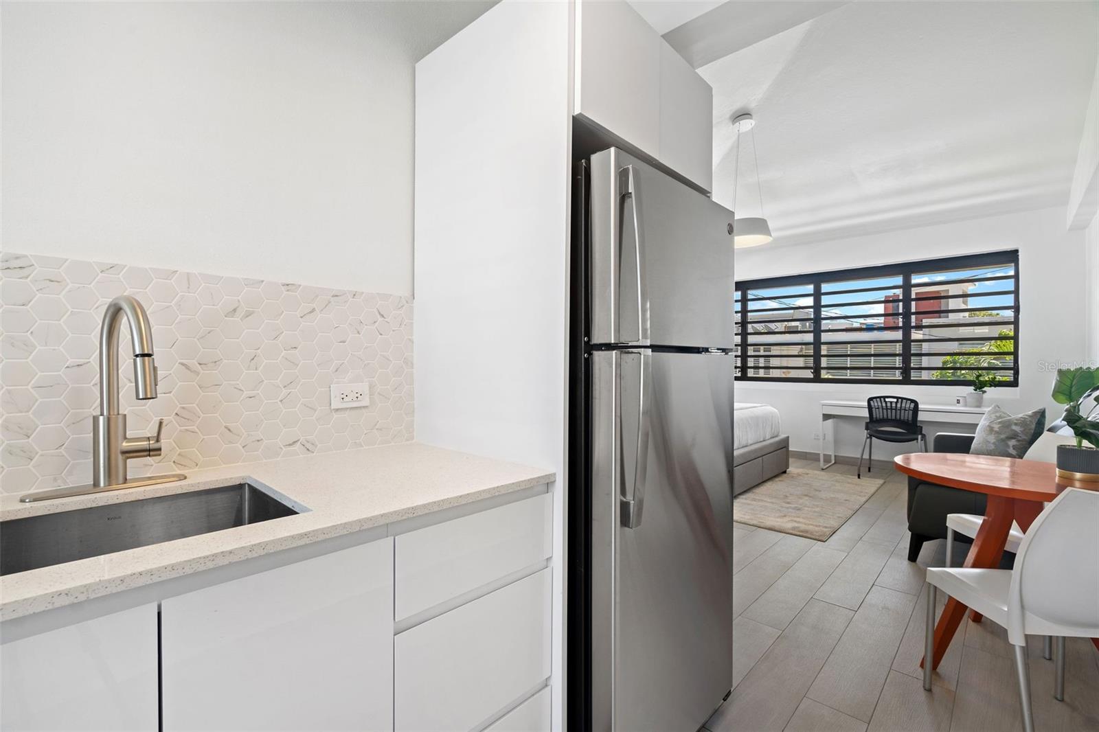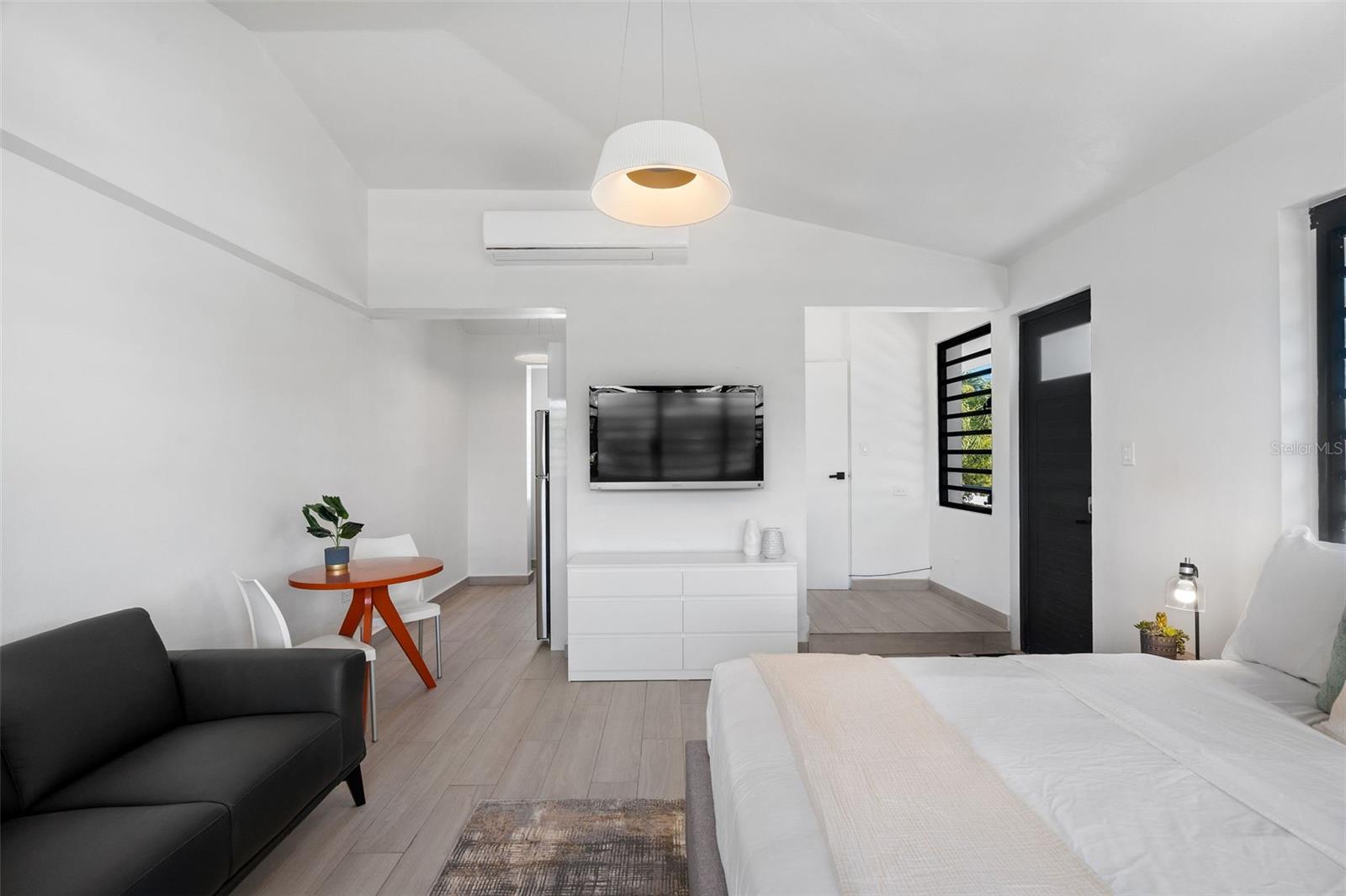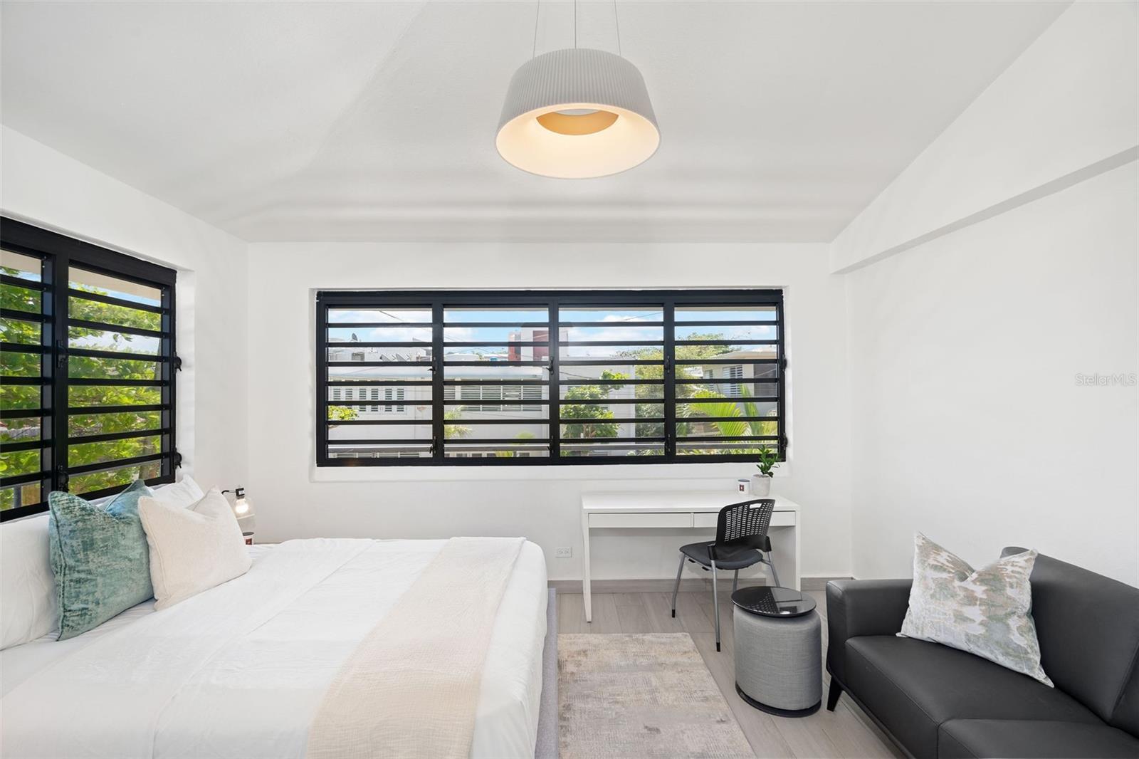 Modern, freshly decorated, fully furnished studio. Home located in the serene Ocean Park neighborhood two blocks from the beach, within walking distance of Calle Loiza with trendy bars and restaurants, and a short ride to Old San Juan and the Airport. Convenient living experience for working professionals with high speed Wi-Fi, emergency power generator, water cistern back up, smart locks, and a washer/dryer on premises. The studio is located on a 2nd. floor with private entrance, wrap around balcony, 9+ foot ceilings, expansive windows providing great cross ventilation and natural light inside, ceramic plank flooring, like new appliances and Fujistu a/c split unit. Monthly rent includes water, Wi-Fi, and community fees, which supports controlled access and 24-hour private security in this gated community. Call now for a private appointment!