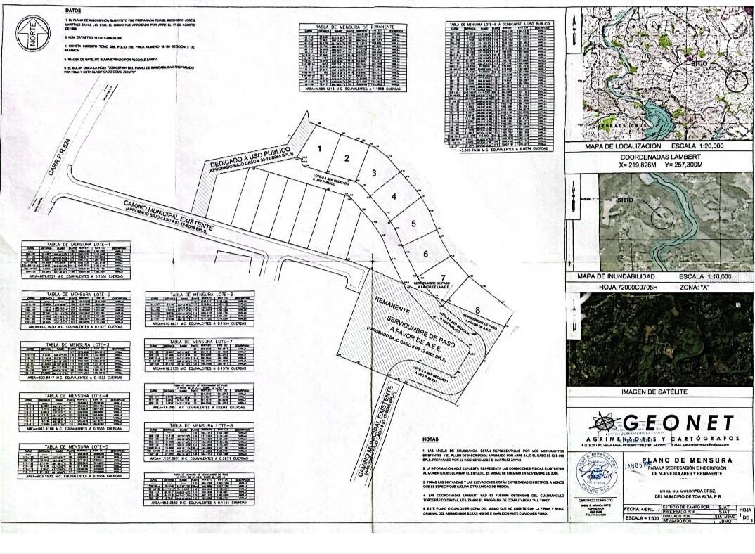 Exceptional opportunity for first-time homebuilders, land buyers, developers and investors in Barrio Quebrada Cruz, Toa Alta. Two contiguous parcels total 8.3173 cuerdas (32,438.496 m² / 349,137 sq ft). Parcel 1 delivers 15 platted lots (~600 m² each): seven frontage lots with paved road, AAA and AEE at $66/m² and eight rear lots at $45/m² (services available nearby; buyer coordinates connections). Parcel 2 adds 5.00 cuerdas for common areas/recreation/future phases. An AEE utility easement crosses the property—review easement map, setbacks and buildable-area implications with AEE and the surveyor. Location: ~3 km (~5 min) to Toa Alta town center; fast links via PR-824 to Hwy-2 (10 km/~15 min) and PR-22 (Toa Baja 18 km/~22 min; Vega Alta 20 km/~25 min); ~10 km (~15 min) to La Plata Reservoir. Financing: may qualify for USDA Single-Close / one-time-close construction-to-perm and construction loans (subject to lender, buyer and property eligibility). Equal Housing Opportunity.