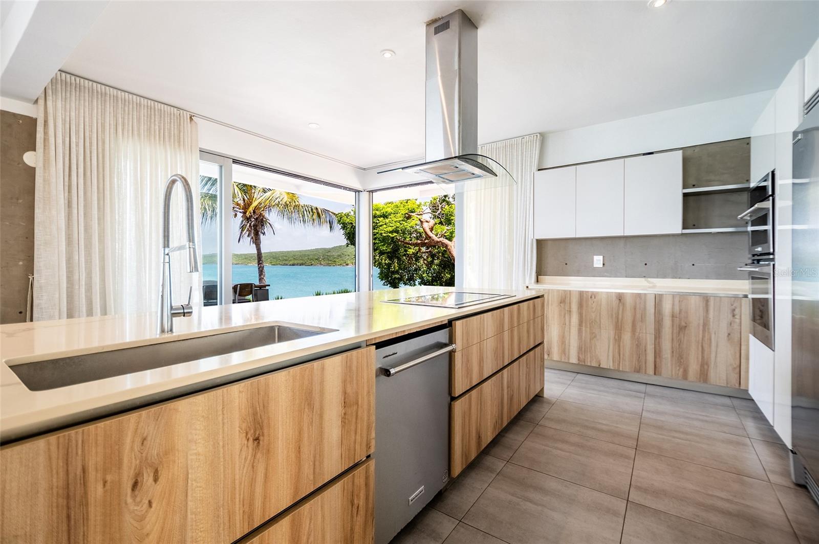 The gourmet DOCA kitchen, outfitted with custom cabinetry and a spacious island, is designed for both culinary excellence and casual dining. The open floor plan, which extends to the outdoor living areas, makes this home ideal for hosting and entertaining. The Italian dining room table, crafted from wood salvaged from Venice gondolas and designed by German architect Piet Hein Eek, adds a unique touch to the dining experience.