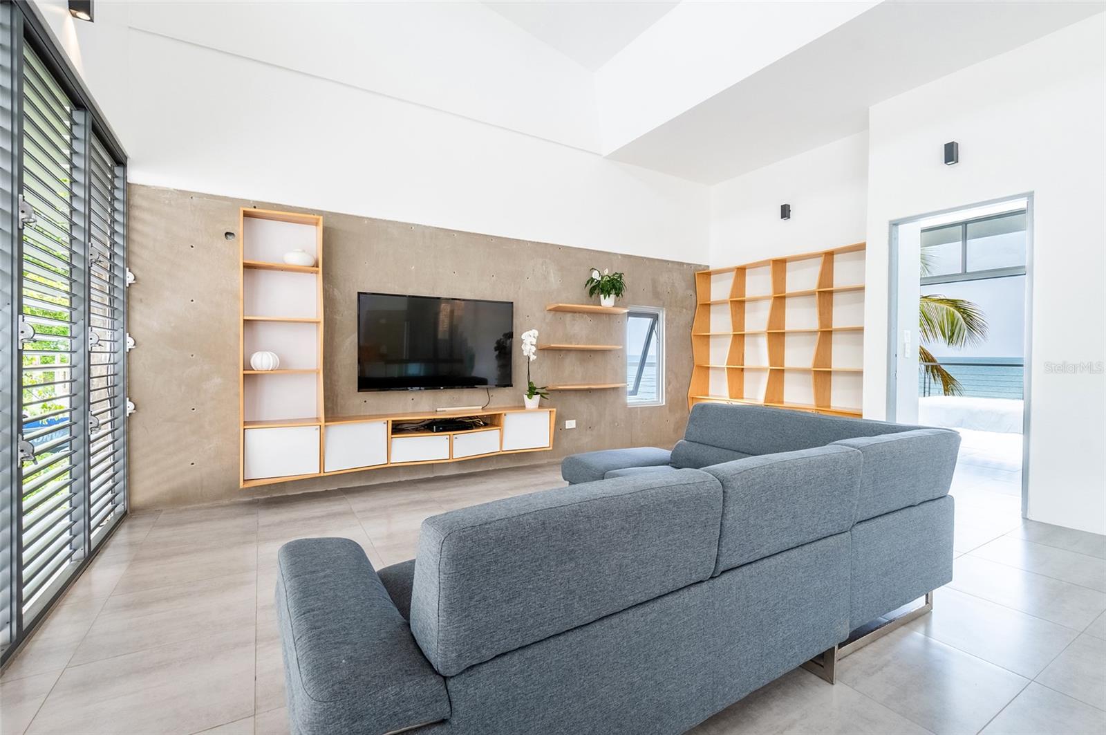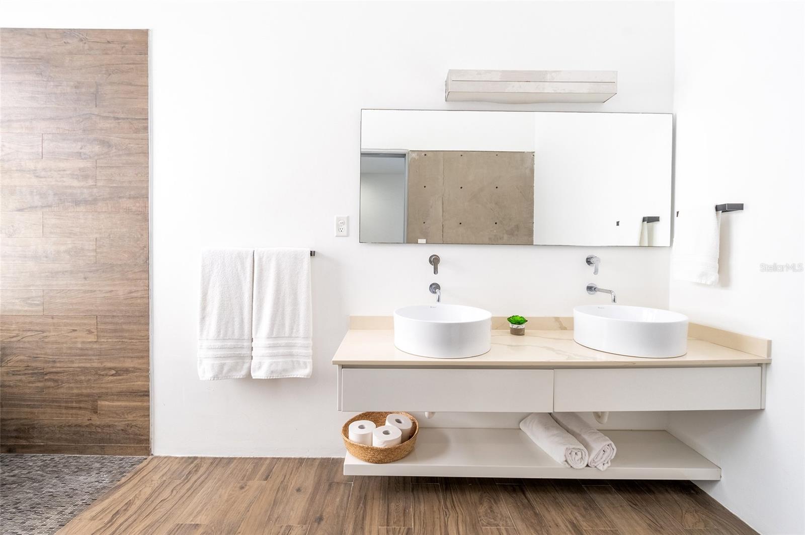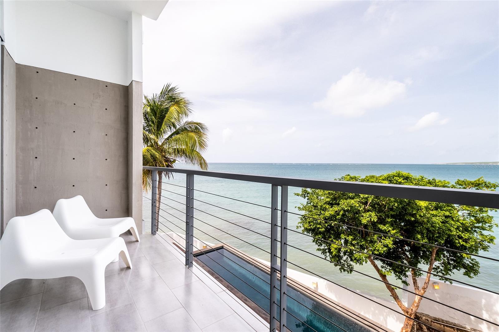 The master suite is a serene sanctuary featuring panoramic views of the Caribbean Sea. The spa-like master bathroom is a retreat in itself, with dual vanities and a walk-in shower. Four additional bedrooms are thoughtfully designed to offer guests comfort and relaxation.