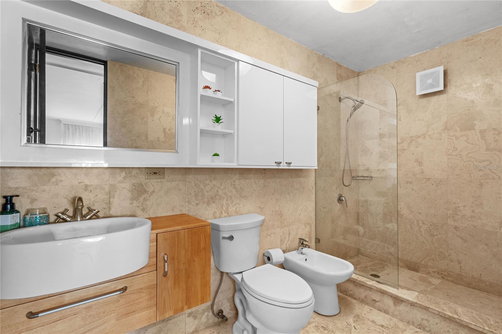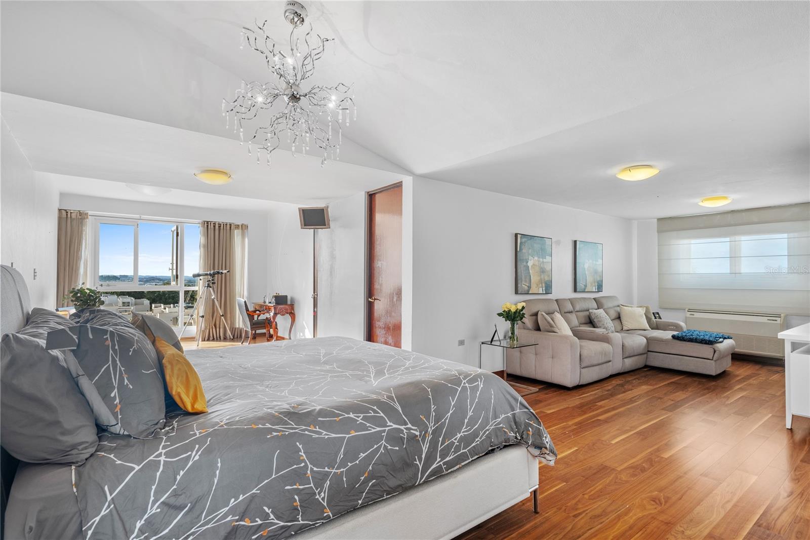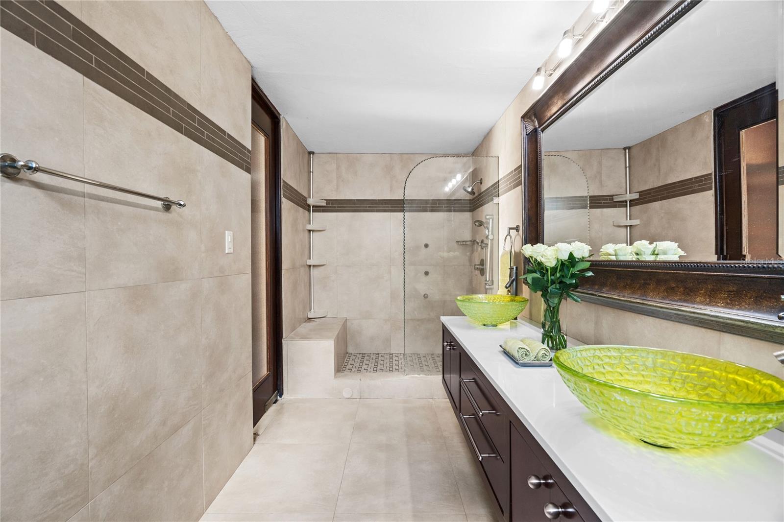 The primary bedroom serves as a retreat, featuring a spacious ensuite bathroom with his-and-hers sinks, a cozy relaxation area with a sofa and TV, and a reading nook with relaxing metropolitan and mountain views.