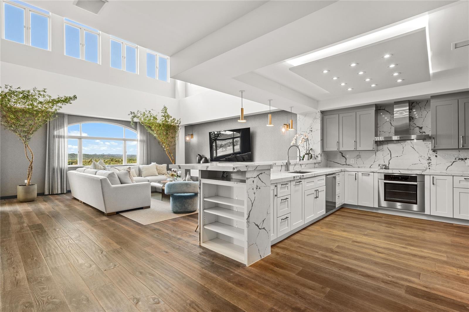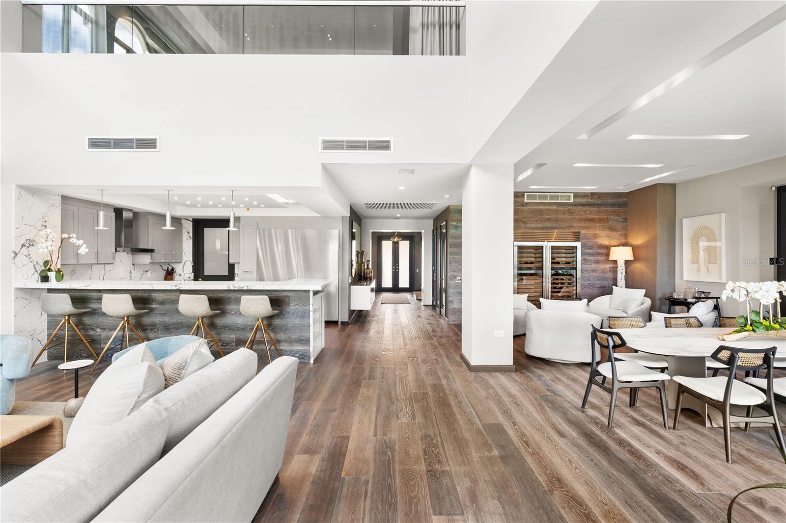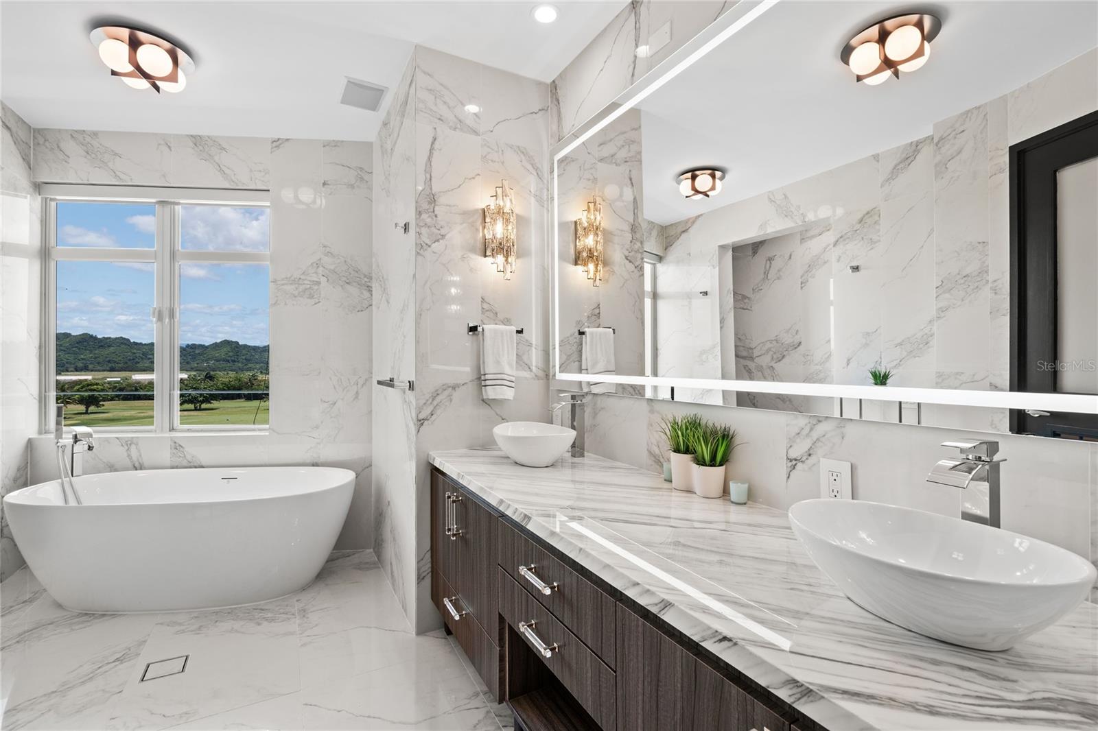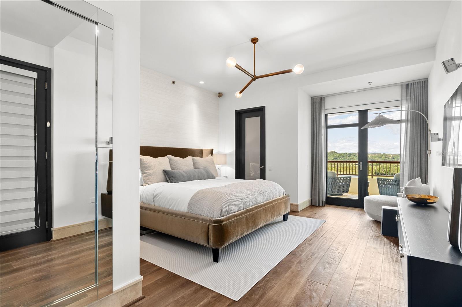Upon entering the living spaces, be captivated by the grandeur of double-height ceilings in the expansive living room creating an atmosphere of elegance and spaciousness. The open floor plan harmoniously blends the living, dining, and kitchen spaces, which are adorned with state-of-the-art Sub-Zero appliances. Designed by renowned local interior designer, Caro Benezar, the interiors epitomize modern luxury and timeless allure. The penthouse features three en-suite bedrooms, each a tranquil retreat, with one conveniently located on the main floor and five lavishly appointed bathrooms—including three full baths and two convenient powder rooms. In addition, there is a dedicated office perfect for those who work from home with built-in cabinetry and views of the golf course.