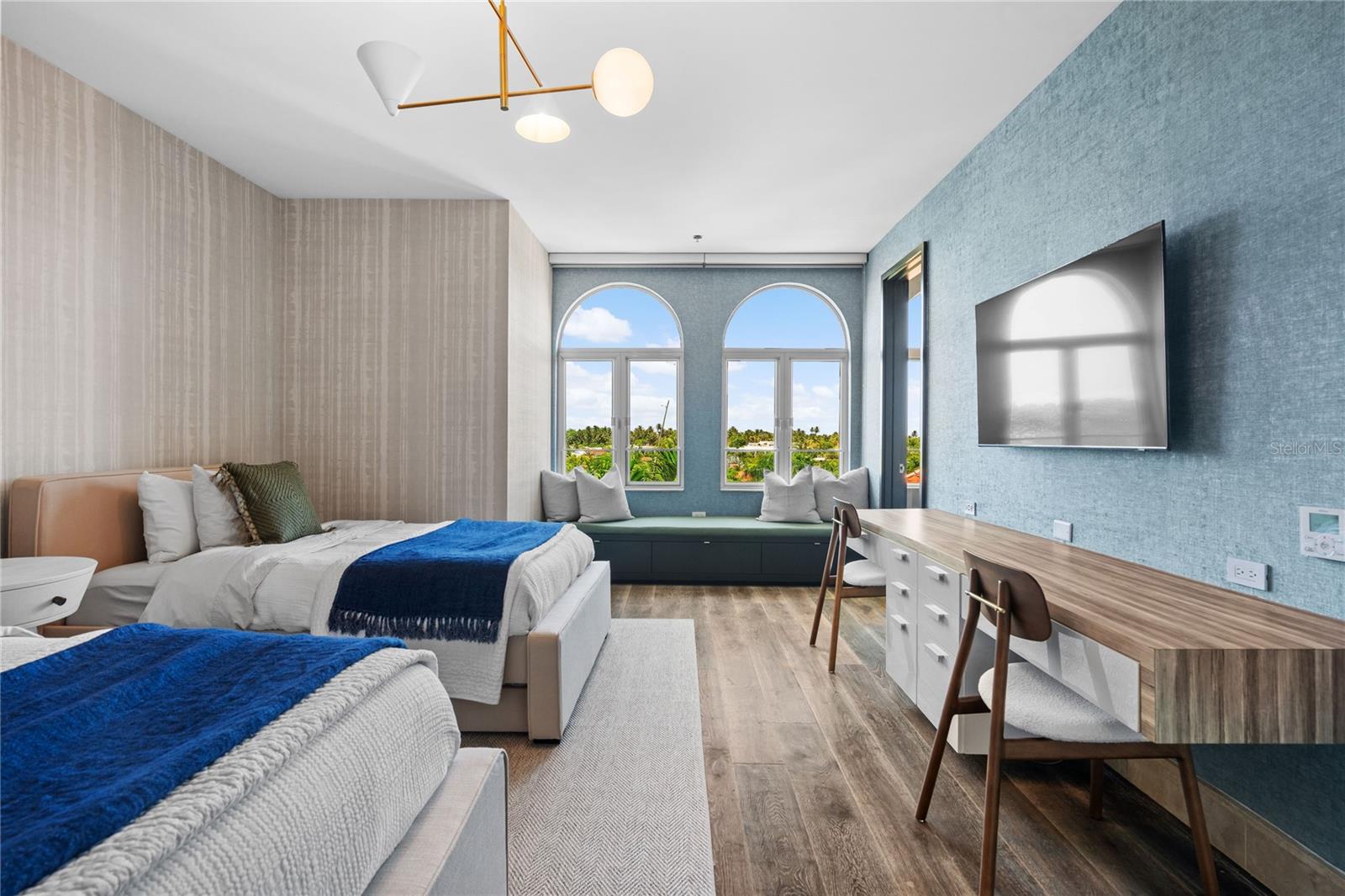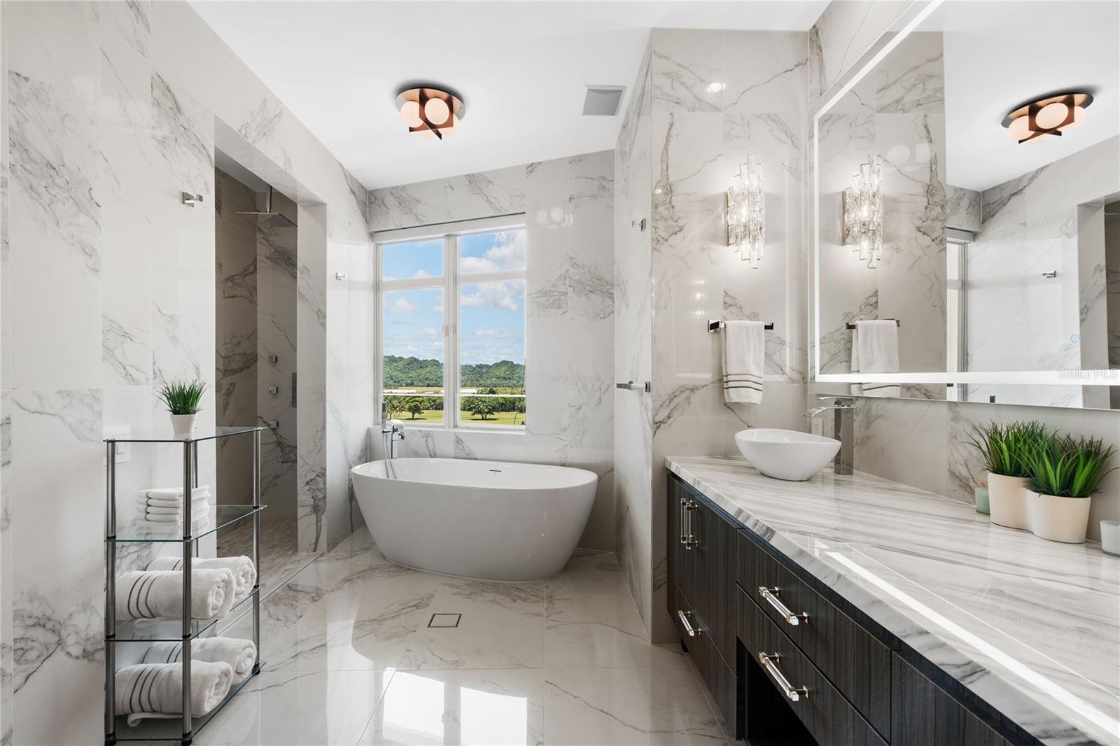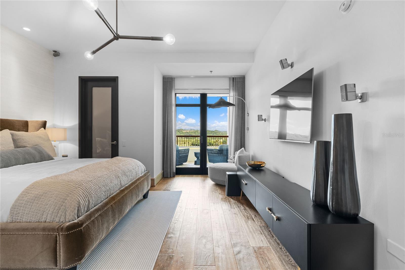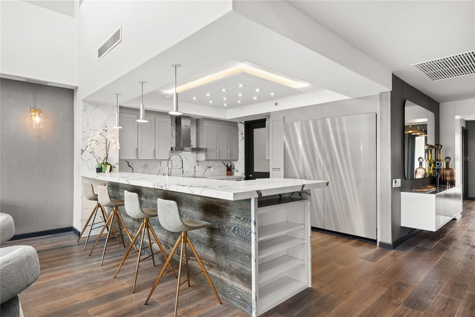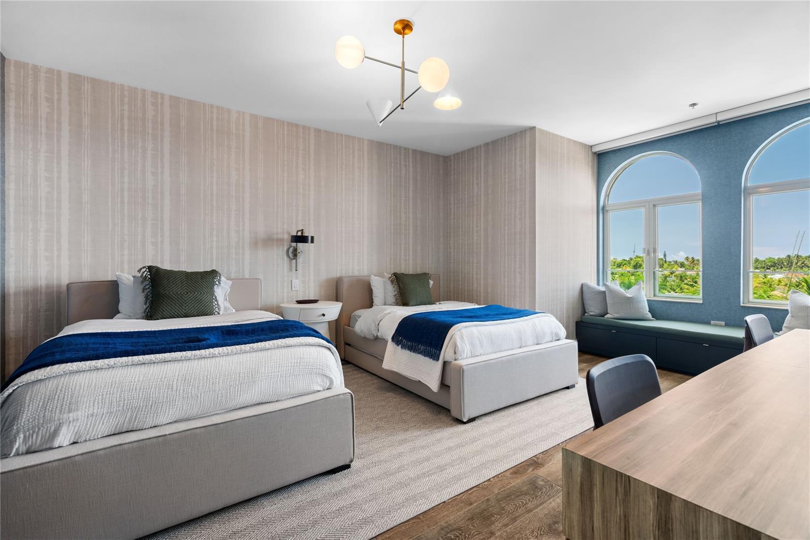 Upon entering the living spaces, be captivated by the grandeur of double-height ceilings in the expansive living room creating an atmosphere of elegance and spaciousness. The open floor plan harmoniously blends the living, dining, and kitchen spaces, which are adorned with state-of-the-art Sub-Zero appliances. Designed by renowned local interior designer, Caro Benezar, the interiors epitomize modern luxury and timeless allure. The penthouse features three en-suite bedrooms, each a tranquil retreat, with one conveniently located on the main floor and five lavishly appointed bathrooms—including three full baths and two convenient powder rooms. In addition, there is a dedicated office perfect for those who work from home with built-in cabinetry and views of the golf course.