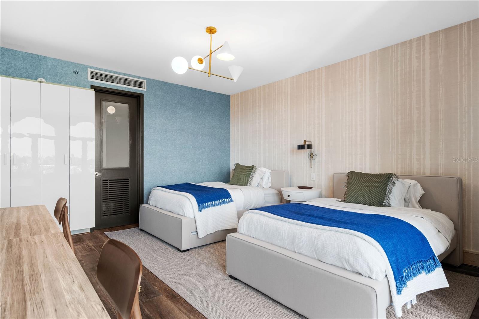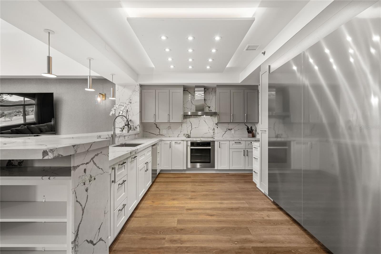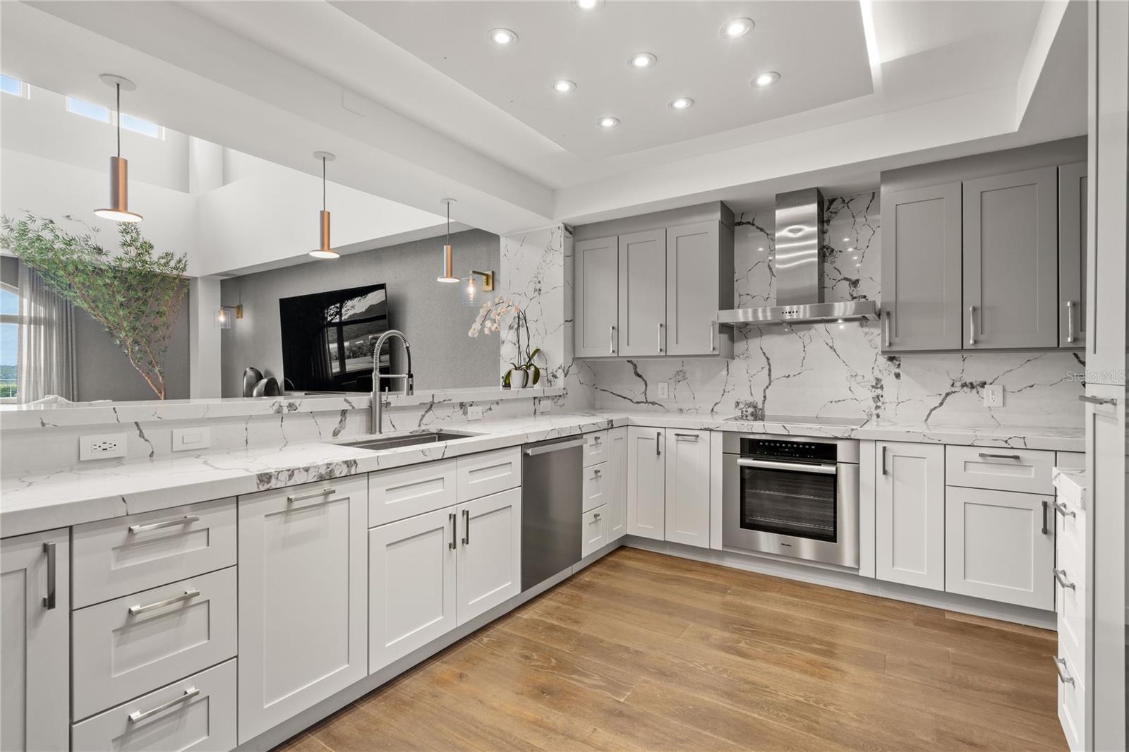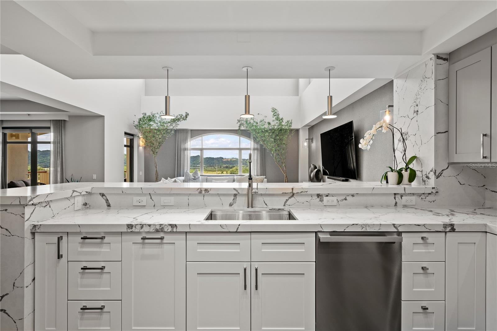 Upon entering the living spaces, be captivated by the grandeur of double-height ceilings in the expansive living room creating an atmosphere of elegance and spaciousness. The open floor plan harmoniously blends the living, dining, and kitchen spaces, which are adorned with state-of-the-art Sub-Zero appliances. Designed by renowned local interior designer, Caro Benezar, the interiors epitomize modern luxury and timeless allure. The penthouse features three en-suite bedrooms, each a tranquil retreat, with one conveniently located on the main floor and five lavishly appointed bathrooms—including three full baths and two convenient powder rooms. In addition, there is a dedicated office perfect for those who work from home with built-in cabinetry and views of the golf course.