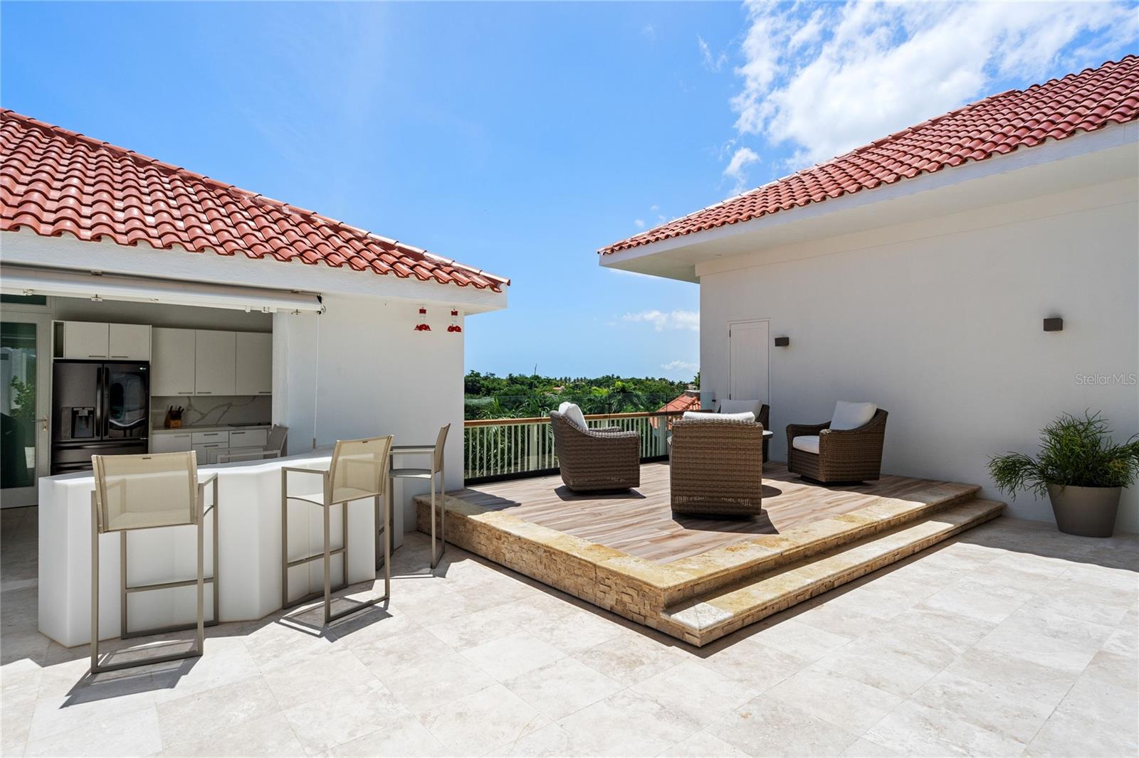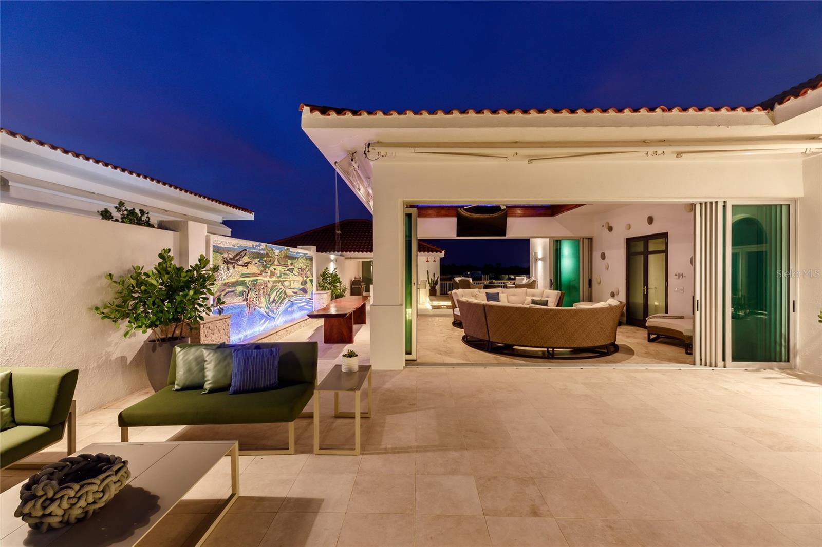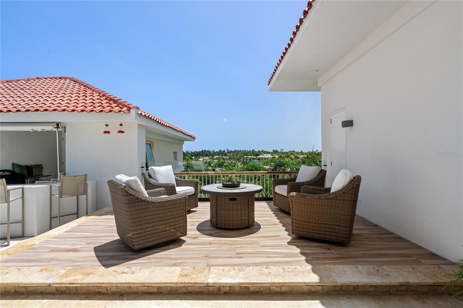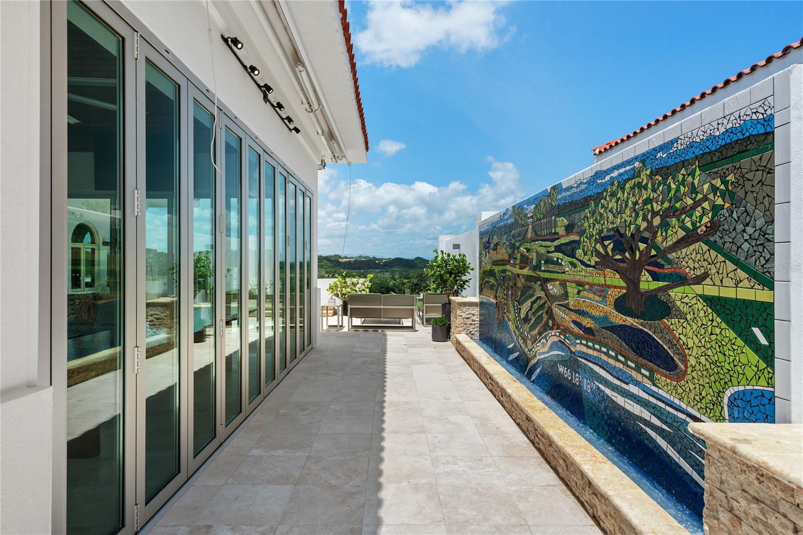 On the second level, which you can access by stairs or a private elevator, you walk into the second living/media area designed for casual relaxation and hangouts.  Off of the media room is the crown jewel of the residence, the expansive rooftop terrace—a true oasis for outdoor living and entertaining or enjoying serene evenings under the stars. Step outside to discover insanely gorgeous views of the golf course and mountaintops which are highlighted by cotton candy sunsets in the evenings.  Serve up the perfect summer BBQ in your outdoor kitchen while hosting friends and family across the multiple seating areas.  To elevate your entertainment experience, there are 2 outdoor TVs with a giant ceiling fan, a robust 5-ton patio air conditioning system ensuring year-round comfort, and retractable accordion doors creating an ideal setting for both daytime relaxation and evening celebrations.  A bespoke mosaic fountain by local artist, Robiaggi Design, serves as an artistic focal point, adding to the terrace’s allure.