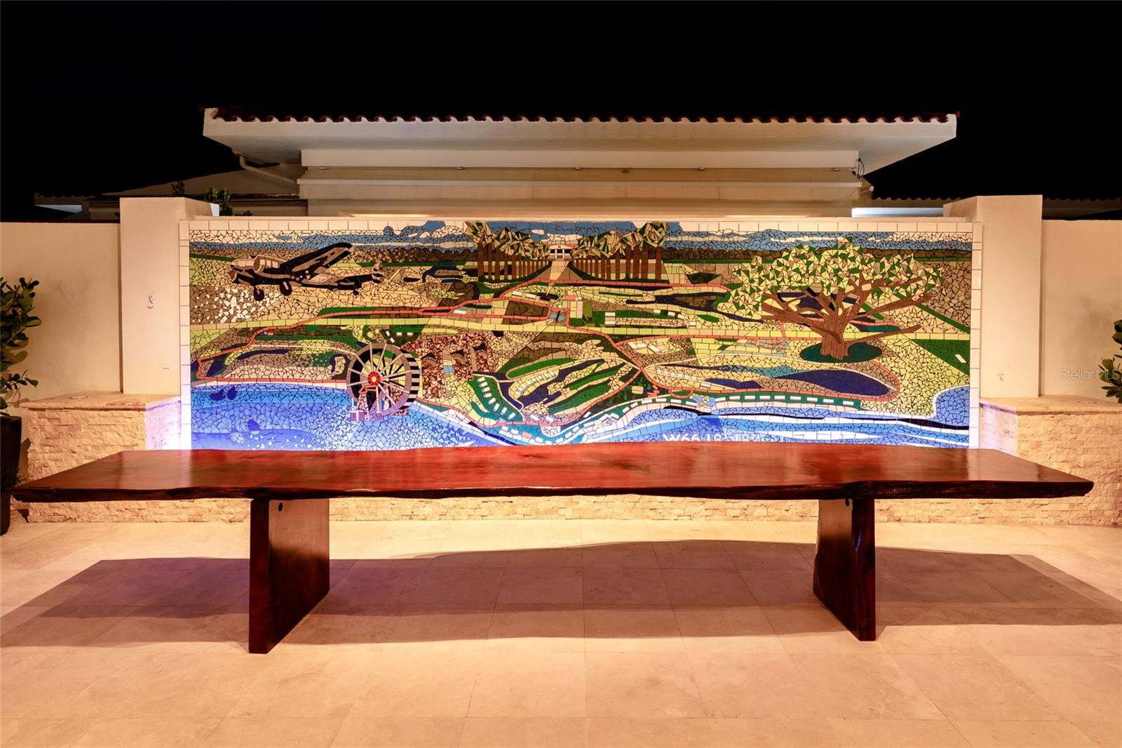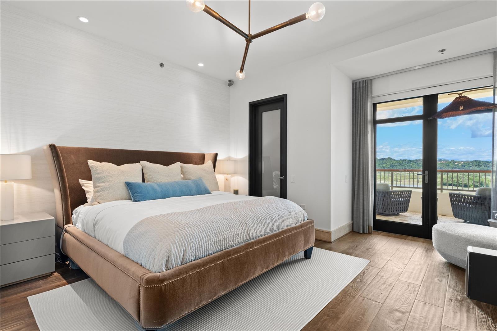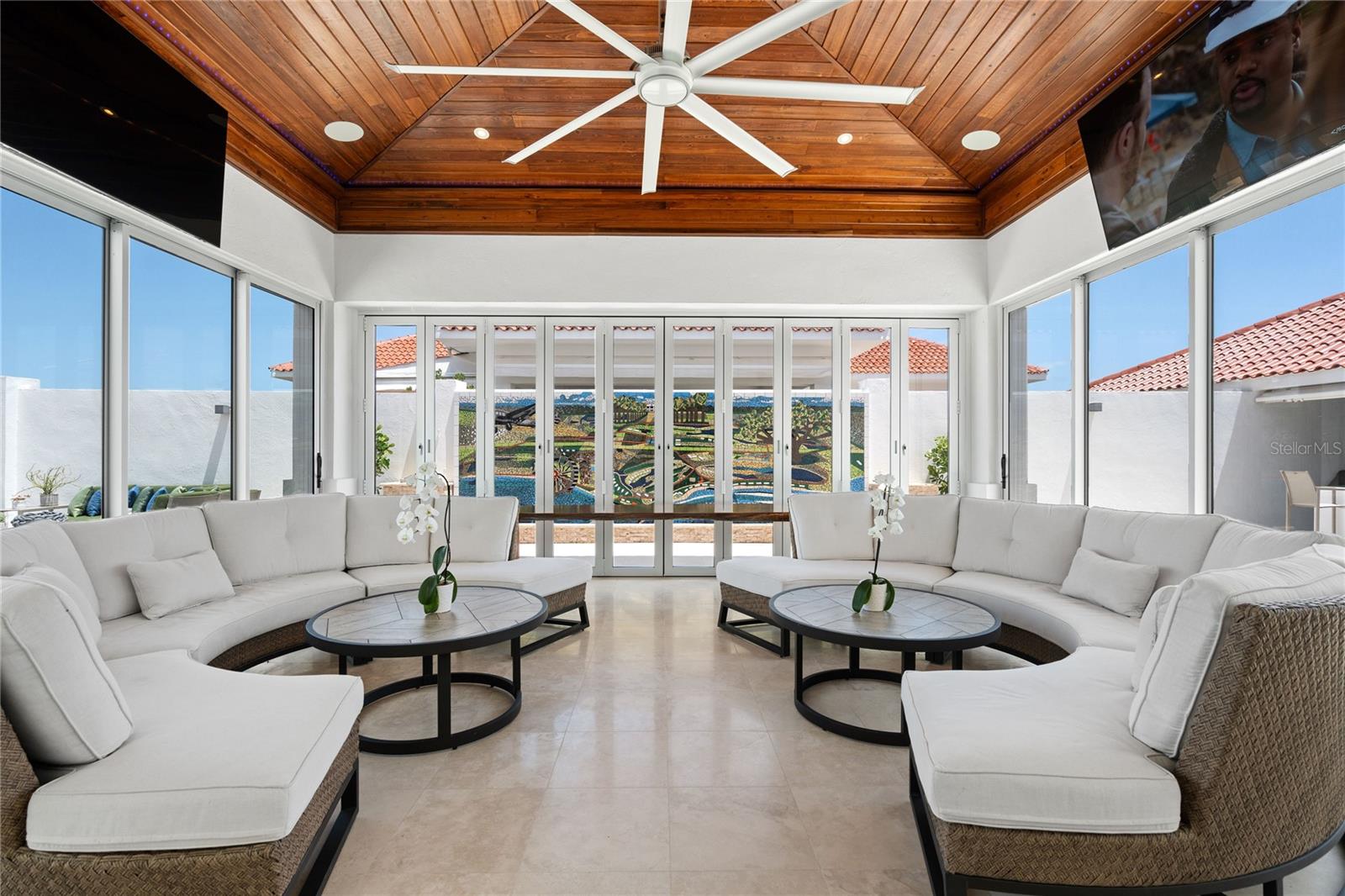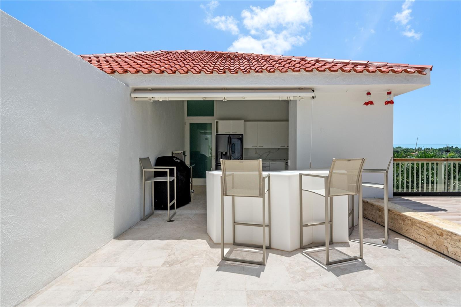 On the second level, which you can access by stairs or a private elevator, you walk into the second living/media area designed for casual relaxation and hangouts.  Off of the media room is the crown jewel of the residence, the expansive rooftop terrace—a true oasis for outdoor living and entertaining or enjoying serene evenings under the stars. Step outside to discover insanely gorgeous views of the golf course and mountaintops which are highlighted by cotton candy sunsets in the evenings.  Serve up the perfect summer BBQ in your outdoor kitchen while hosting friends and family across the multiple seating areas.  To elevate your entertainment experience, there are 2 outdoor TVs with a giant ceiling fan, a robust 5-ton patio air conditioning system ensuring year-round comfort, and retractable accordion doors creating an ideal setting for both daytime relaxation and evening celebrations.  A bespoke mosaic fountain by local artist, Robiaggi Design, serves as an artistic focal point, adding to the terrace’s allure.