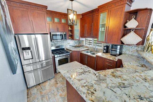 Kitchen with granite counter tops, wood cabinets, stainless steel gas stove microwave and refrigerator. The cabinets are wood laminated inside and out. The living room is spacious with a l-shaped couch and entertainment center housing a large flat screen tv.