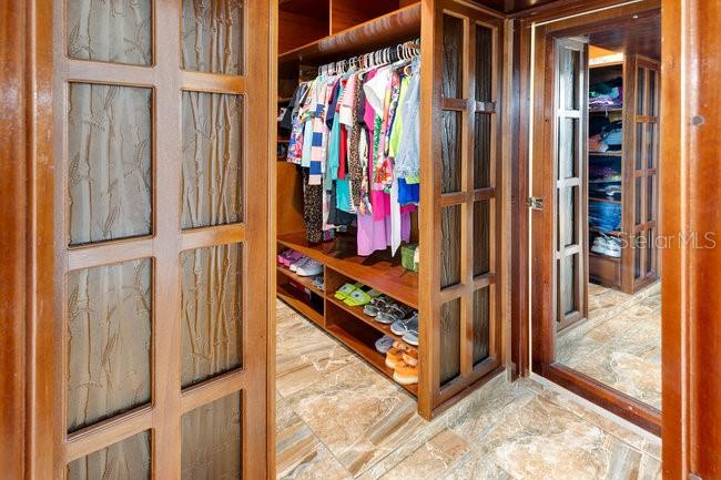 The primary bedroom with walk in closet and ensuite with decorative tile and easily accessible shower. It leads to a terrace with a laundry area plus a room/office the batteries for the solar system are located.
