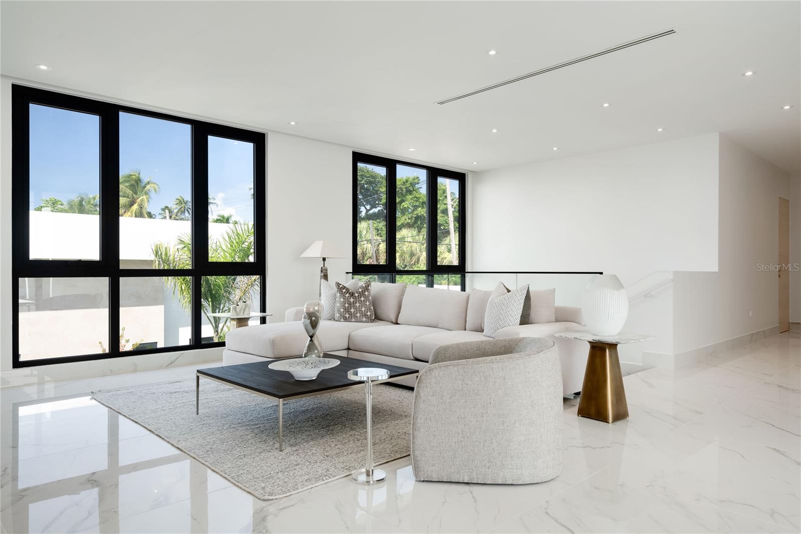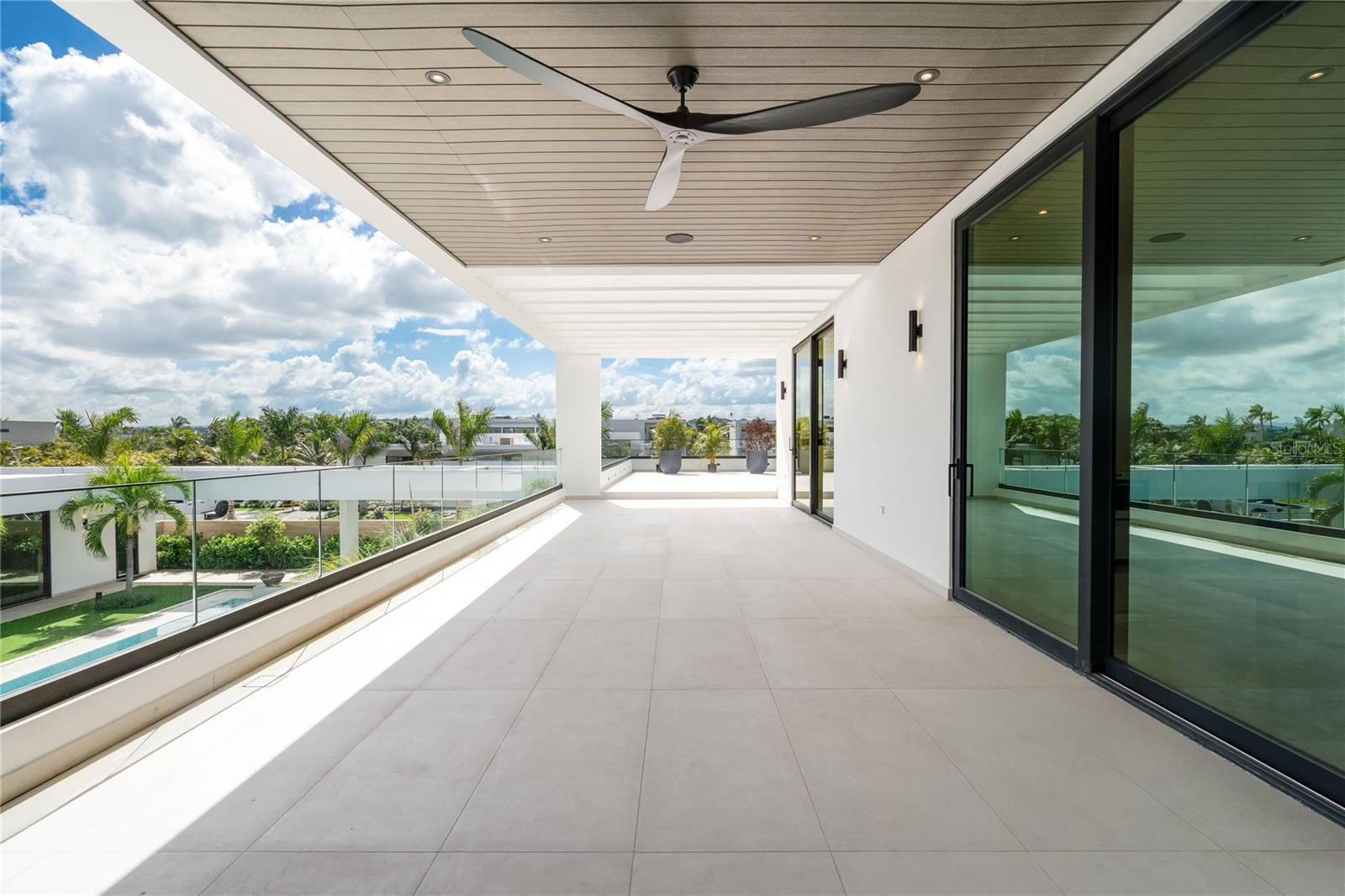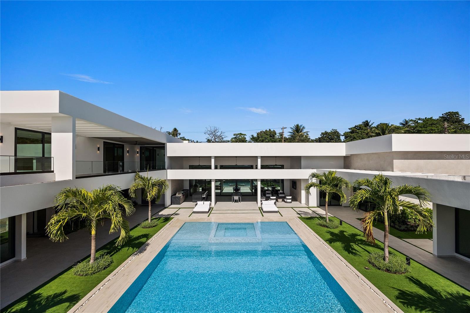 The home is equipped with premium upgrades throughout, including a Culligan water softener, ceiling speakers, sound bars, and subwoofers for an immersive audio experience. Doors and windows by Alumni from the Durabella Group combine elegance with durability. The property’s thoughtful infrastructure includes an 800-gallon cistern and a 300-gallon irrigation system to support sustainable water management. The upper level feels like a home within a home, featuring three additional bedrooms, a family room, a second laundry room, and two terraces—one covered with views of the courtyard and another open-air terrace overlooking the surrounding mountains. Designed for relaxation and entertaining, the outdoor spaces include expansive covered terraces, a large pool, a convenient pool bath, and an outdoor shower nestled within lush landscaping on a 2,500-square-meter (26,909 sq. ft.) lot. A three-car garage with a golf cart bay and extra storage completes the home. This exquisite property is more than just a residence—it’s a luxurious sanctuary designed for family connection and entertaining on the beautiful island of Puerto Rico