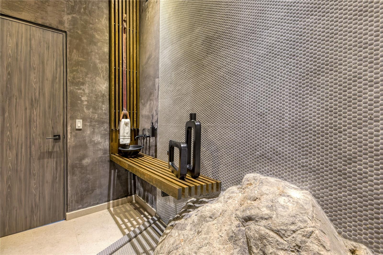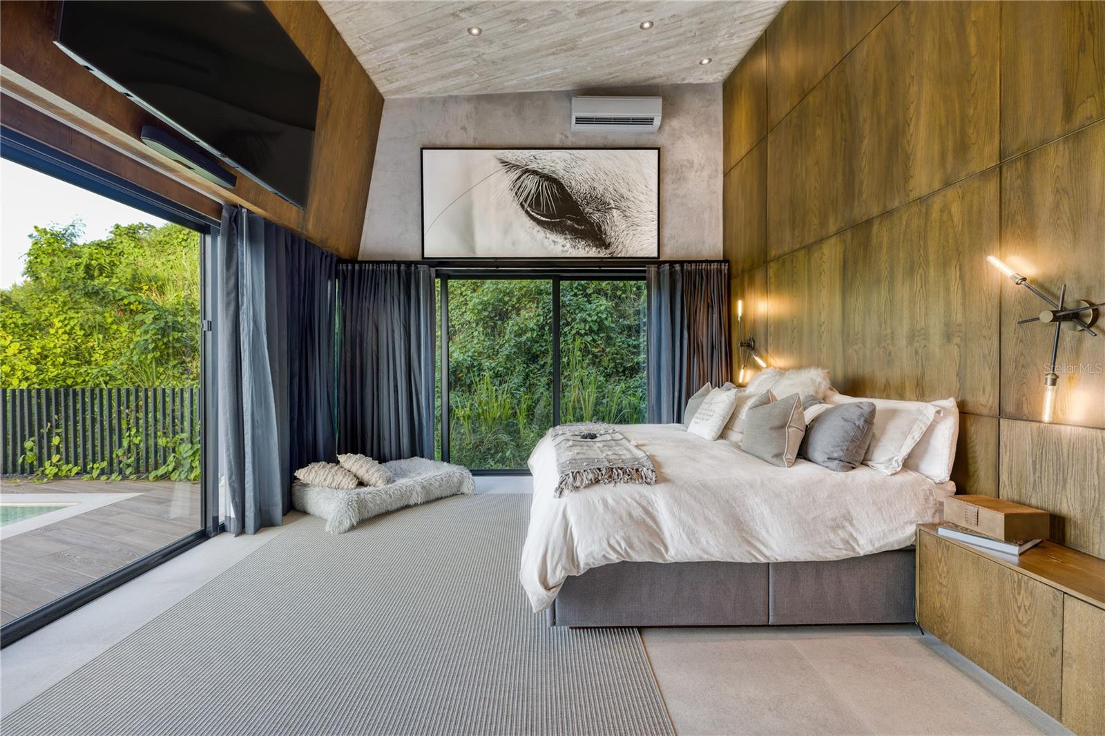 The residence's well-appointed interior layout spans approx. 3,823 Sq. Ft. and the covered outdoor area provides approx. 455 Sq. Ft. of additional space, for a total of 4,278 sq. ft of shere perfection.. The property's first level features floor to ceiling glass walls with a height of 13’5’’ overlooking a waterfall cascading from the hilltops above, as well as a living room, dining room, designer kitchen, two ensuite bedrooms, including the primary suite with direct access to the terrace with pool, outdoor kitchen with BBQ area and powder room.