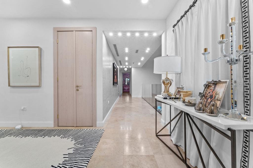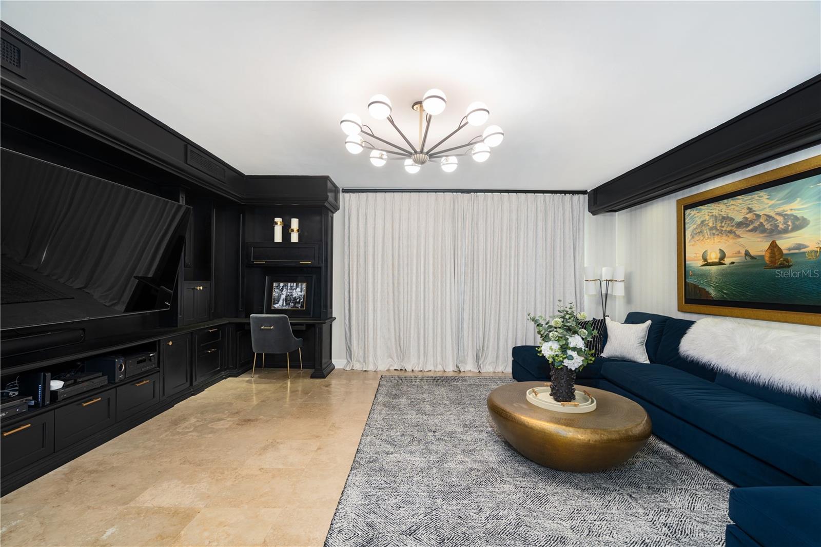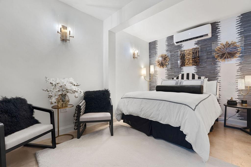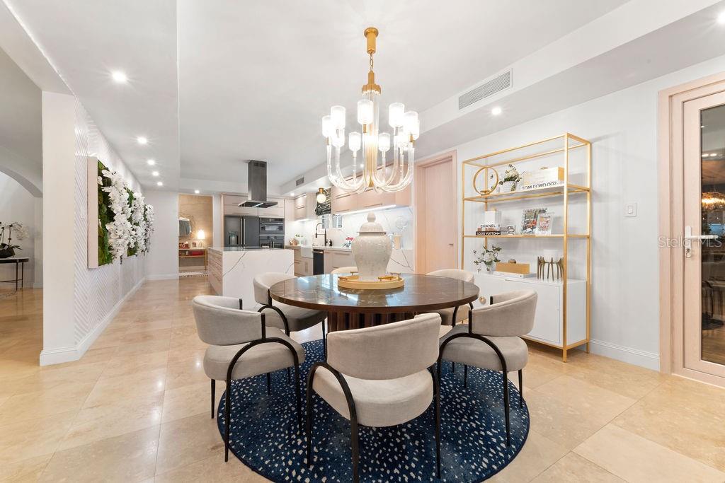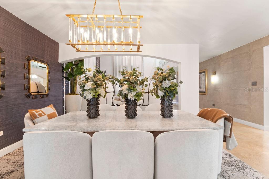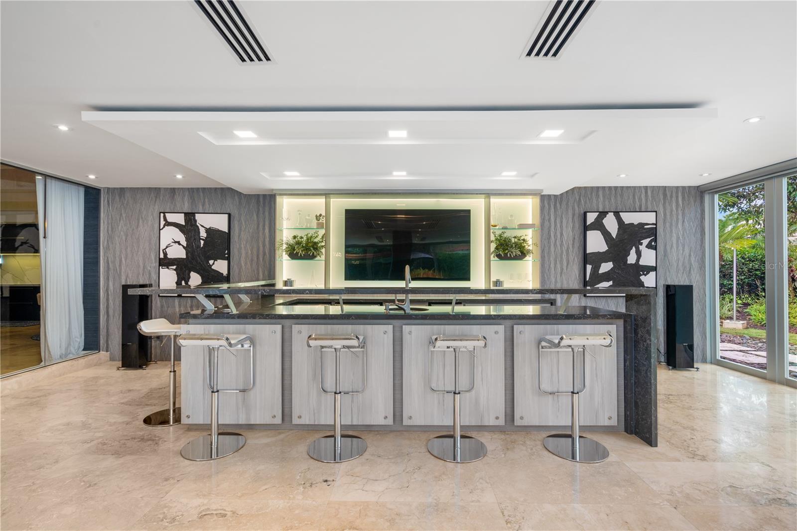 This Dorado Beach East residence offers 5,813 interior sq ft with high-end finishes throughout. The 5-bedroom, 5.5-bath layout includes designer wallpapers, curated furnishings, and high ceilings. The open dining and living areas extend into an enclosed terrace with floor-to-ceiling glass, a custom bar with ice maker and wine fridge, and a billiard table.