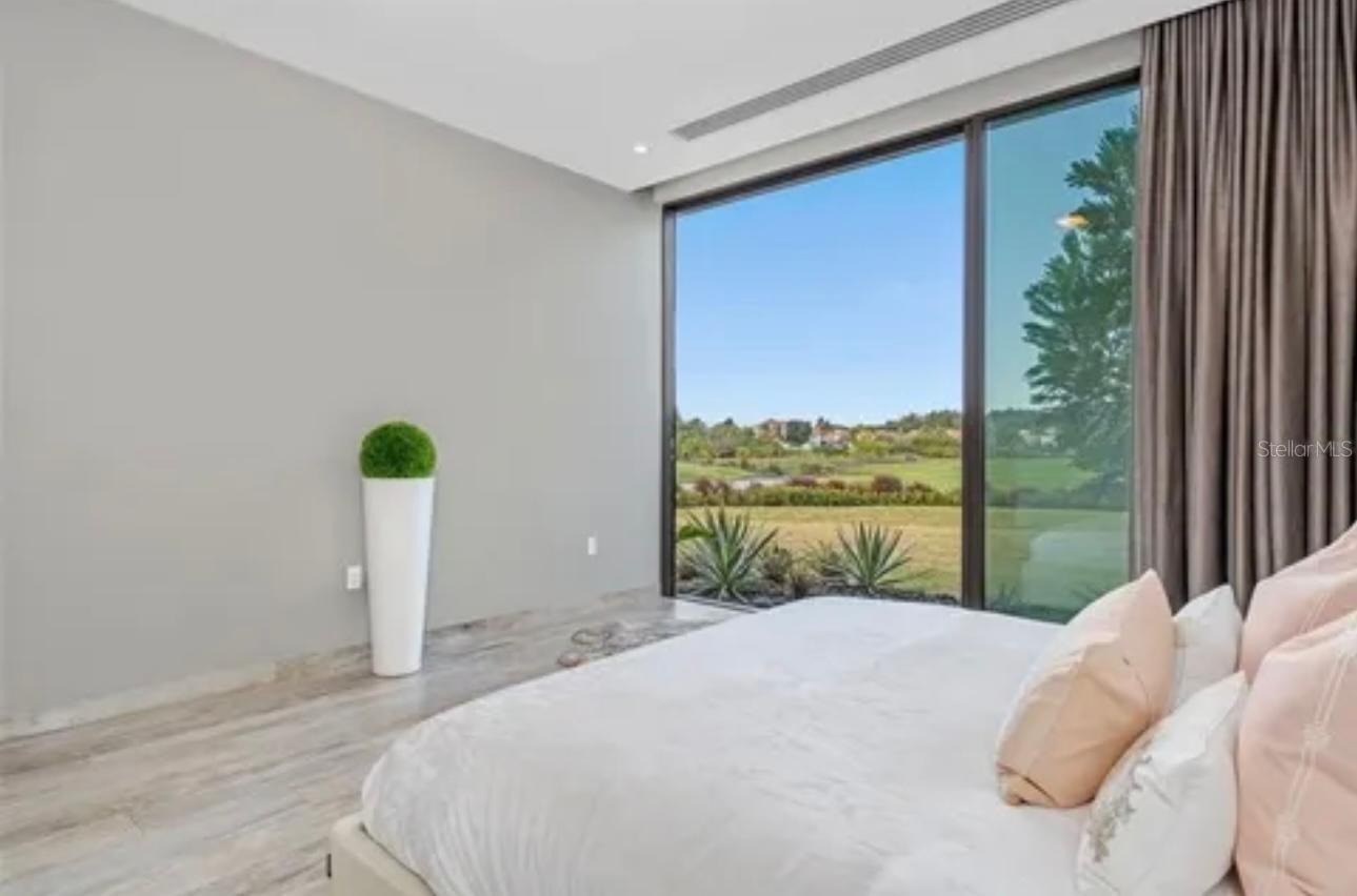 The master suite is a serene retreat, offering direct access to the backyard, a spacious walk-in closet, and a spa-inspired bath that features dual showers, a soaking tub, and an outdoor shower – creating a resort-like experience. The covered terrace extend the living space outdoors, where the tranquil lake and golf course vistas set the stage for intimate gatherings and lavish entertainment.