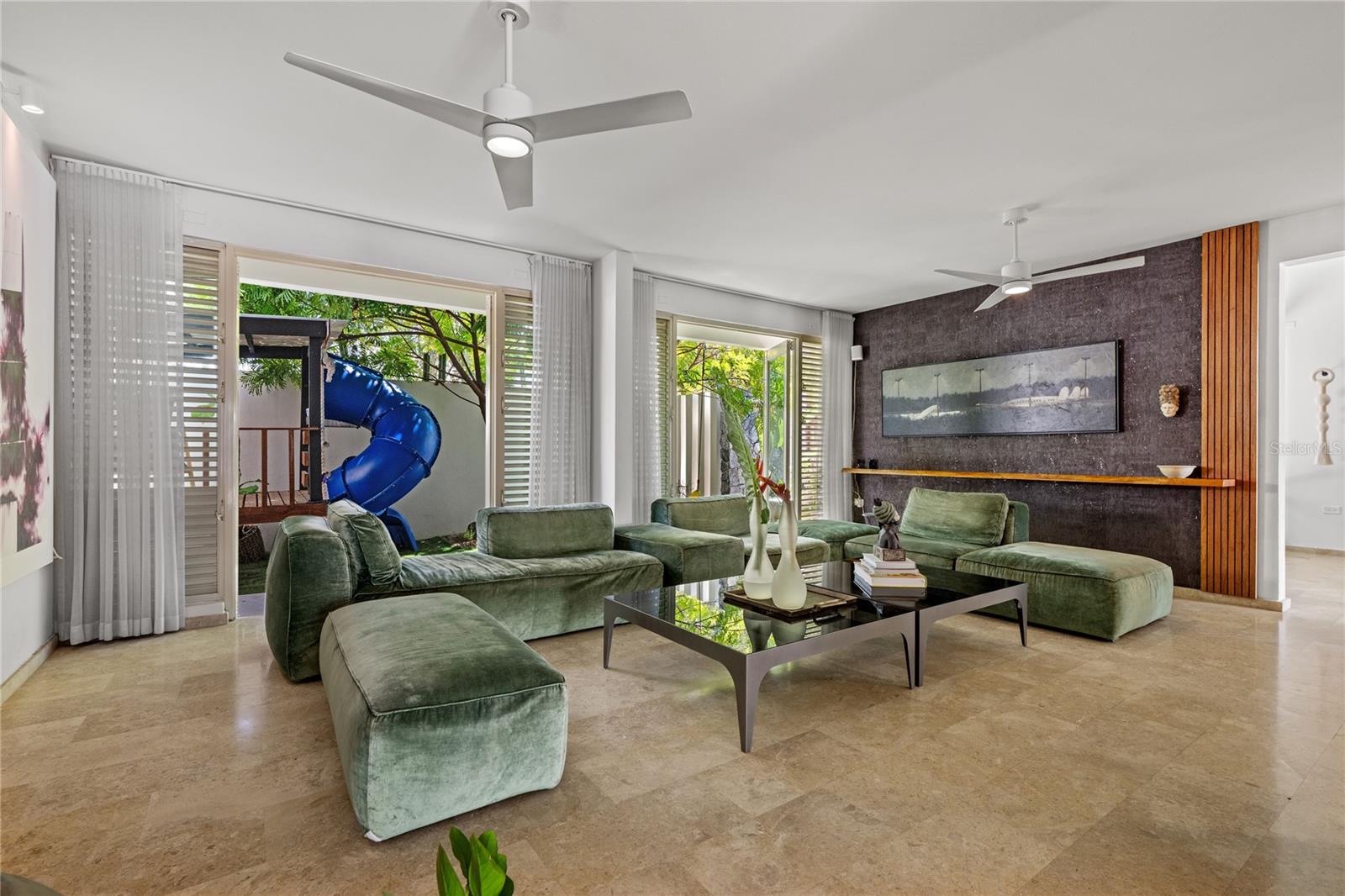 Upon arrival, you are greeted by soaring 20-foot ceilings and bespoke natural stone flooring that extends gracefully throughout the home. Expansive 9-foot ceilings carry through the main living areas, where custom Puerto Rican hardwood accents and designer furnishings by Bonaldi—curated by Attiko—cultivate a sophisticated yet inviting atmosphere. Integrated Sonos audio, Century Lighting, and hurricane-rated Airmaster windows enhance both comfort and peace of mind.