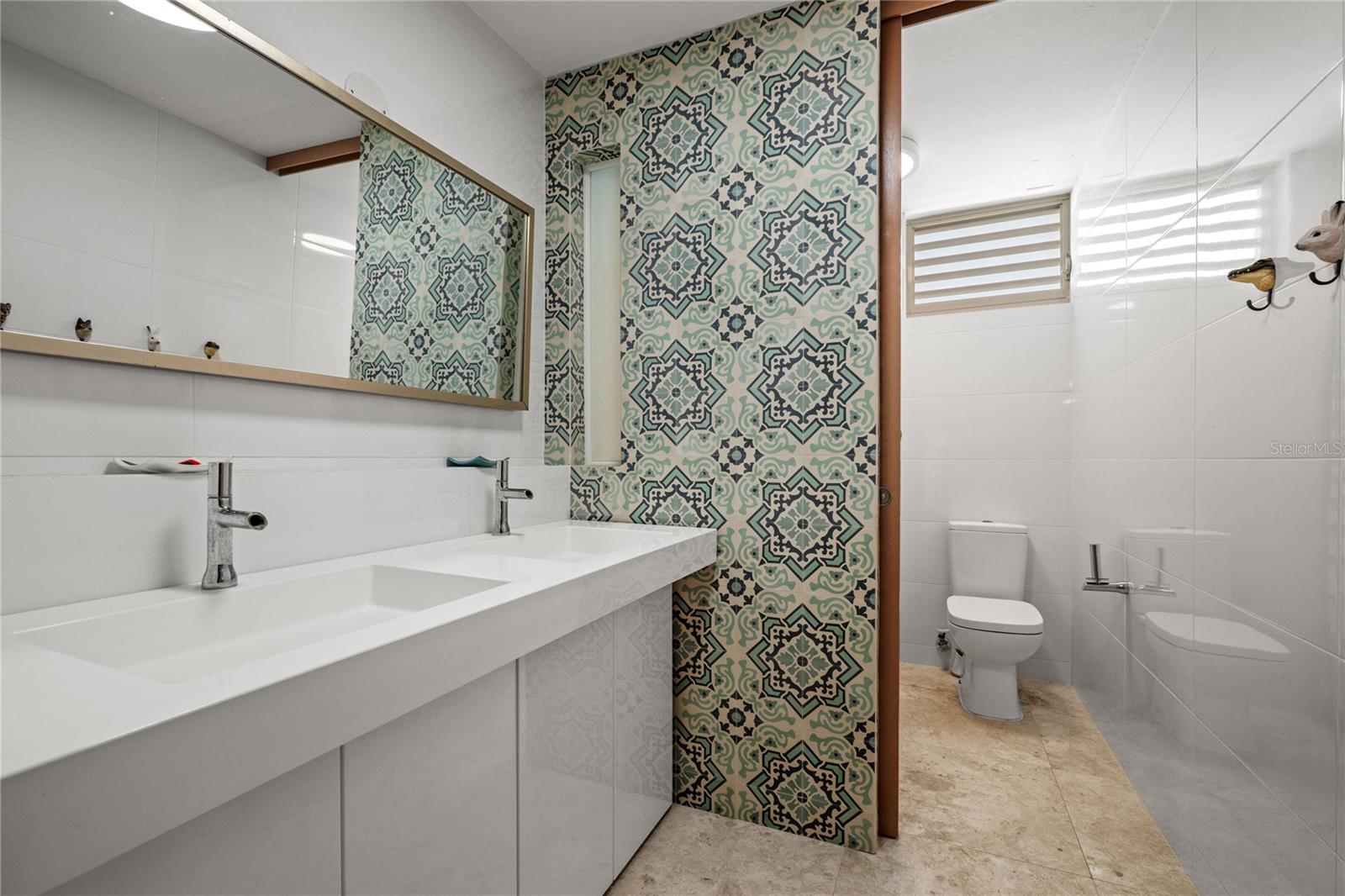 Upstairs, a guest suite with a 400-square-foot private terrace and spa-inspired bathroom—featuring an open-air shower experience—provides a peaceful sanctuary. The primary suite boasts vaulted 16-foot ceilings, a marble shower, Roca toilets, and Kohler fixtures. Three additional guest bedrooms are served by a full bath with a soaking tub.