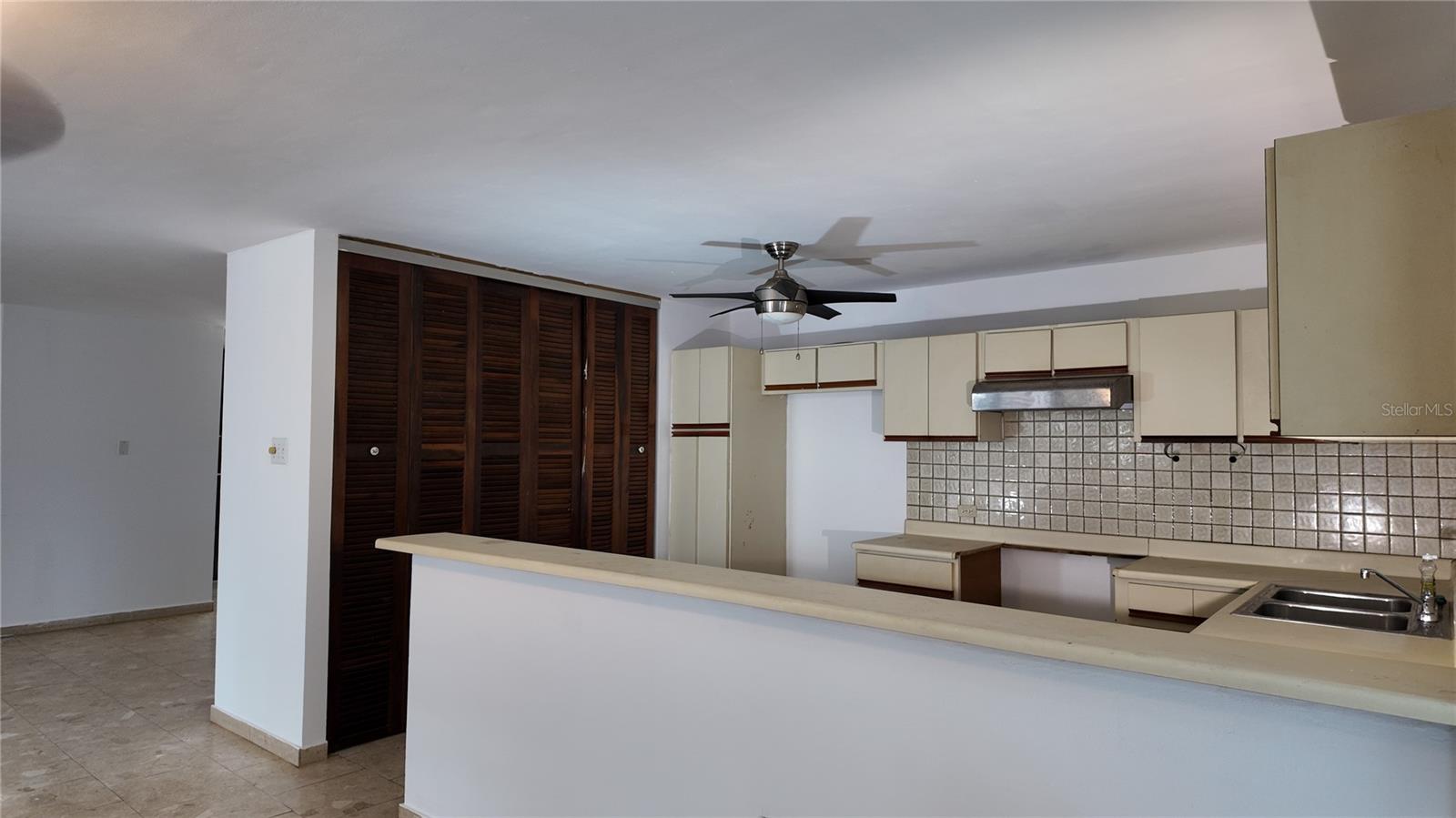 The open kitchen offers excellent potential for modernization and connects to a second living area, perfect as a breakfast nook or family room. All common areas are equipped with ceiling fans and security window bars for added comfort and peace of mind.