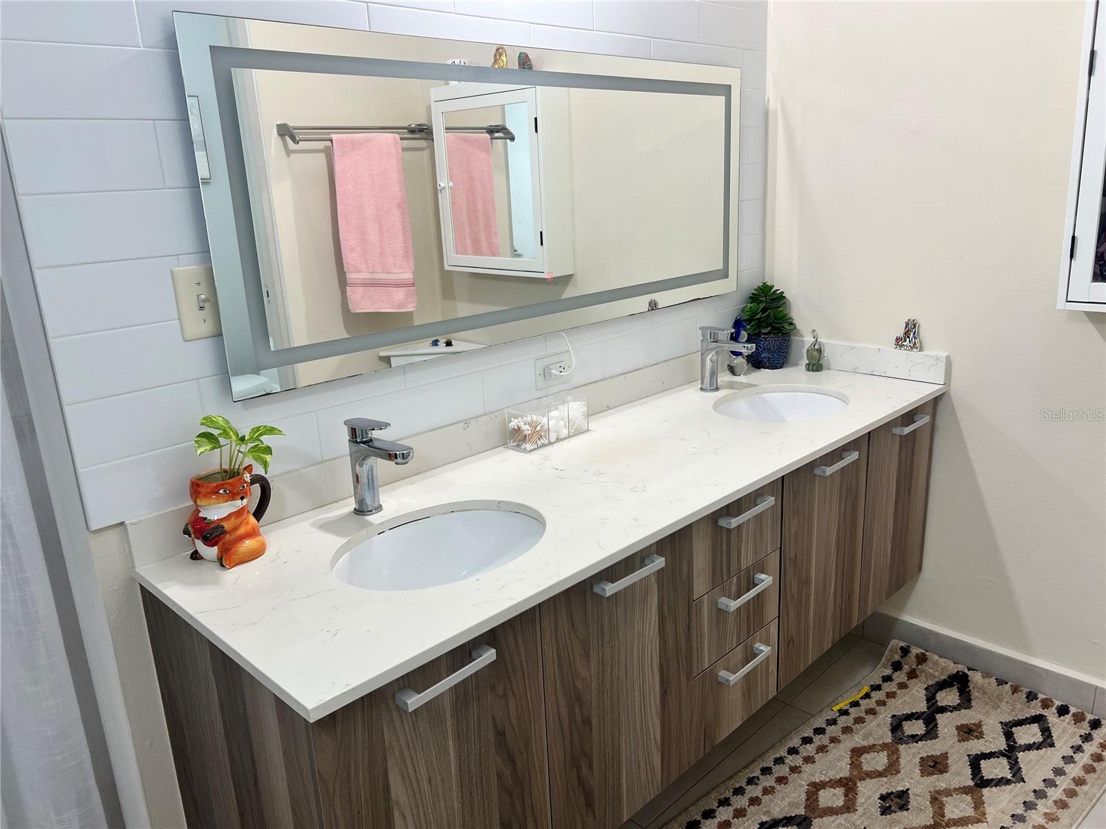 The interior layout includes 11-foot ceilings with fascias in the living and family room areas, a dining area, and a kitchen with European-style cabinetry and quartz countertops. The laundry area is adjacent to the kitchen. The primary bedroom measures approximately 15'3" x 14'6" and includes a walk-in closet and an en-suite bathroom with double vanity, quartz countertop, shower, and a private room for the toilet and bidet.
