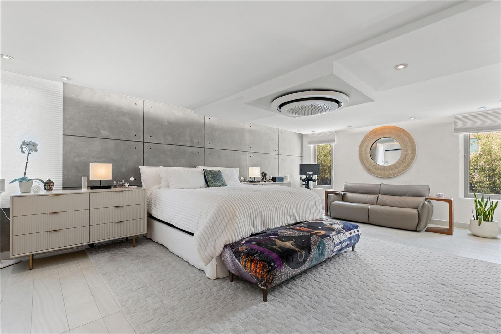 The property also features an exclusive living room with an integrated bar and stools, perfect for sharing with family or friends while enjoying the beautiful view of the pool and terrace. The glass walls allow natural light to flood the space, creating a peaceful and harmonious atmosphere.