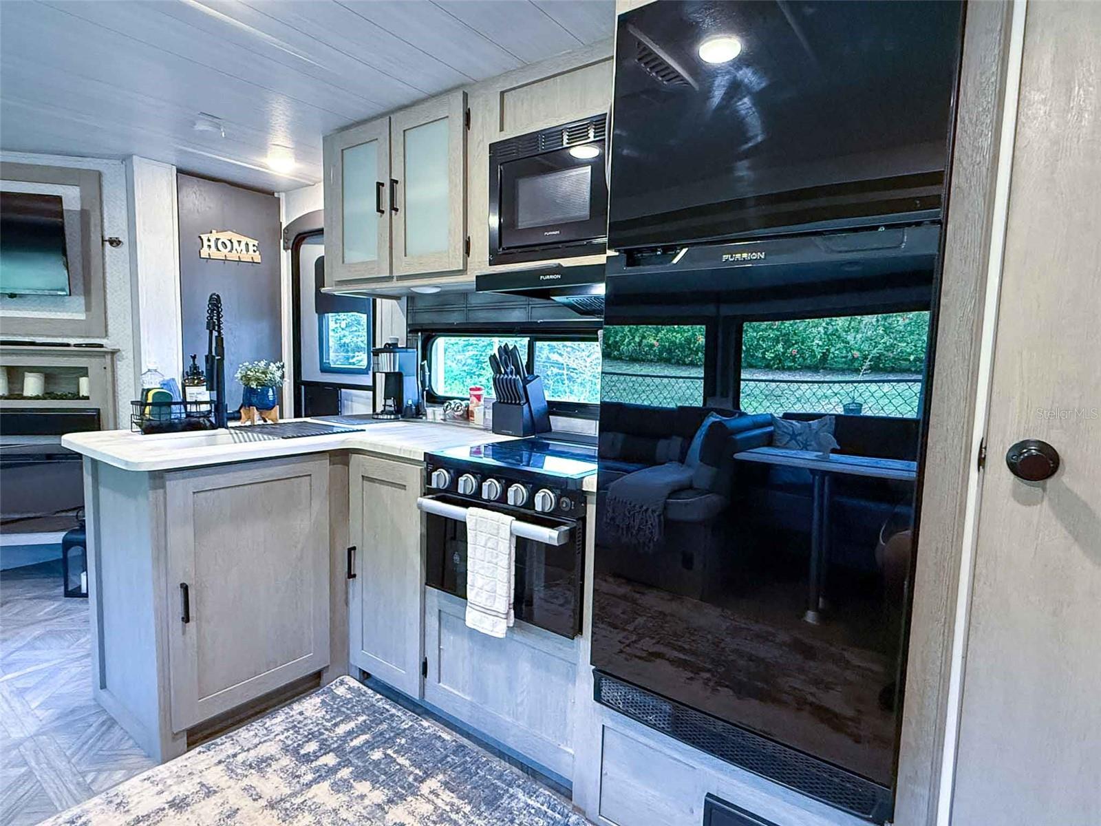 The primary structure is a Forest River Salem Platinum RV (26DBUD floorplan) permanently installed on a concrete pad and protected by a custom-built metal roof. Inside, the RV features a queen-size primary bedroom with built-in closets, a cozy lounge area with decorative fireplace and TV, a full kitchen, dining space, bunk beds, and a full bathroom. Large windows throughout bring in natural light and frame the surrounding tropical landscape. The RV is fully air-conditioned and comfortably sleeps up to six.