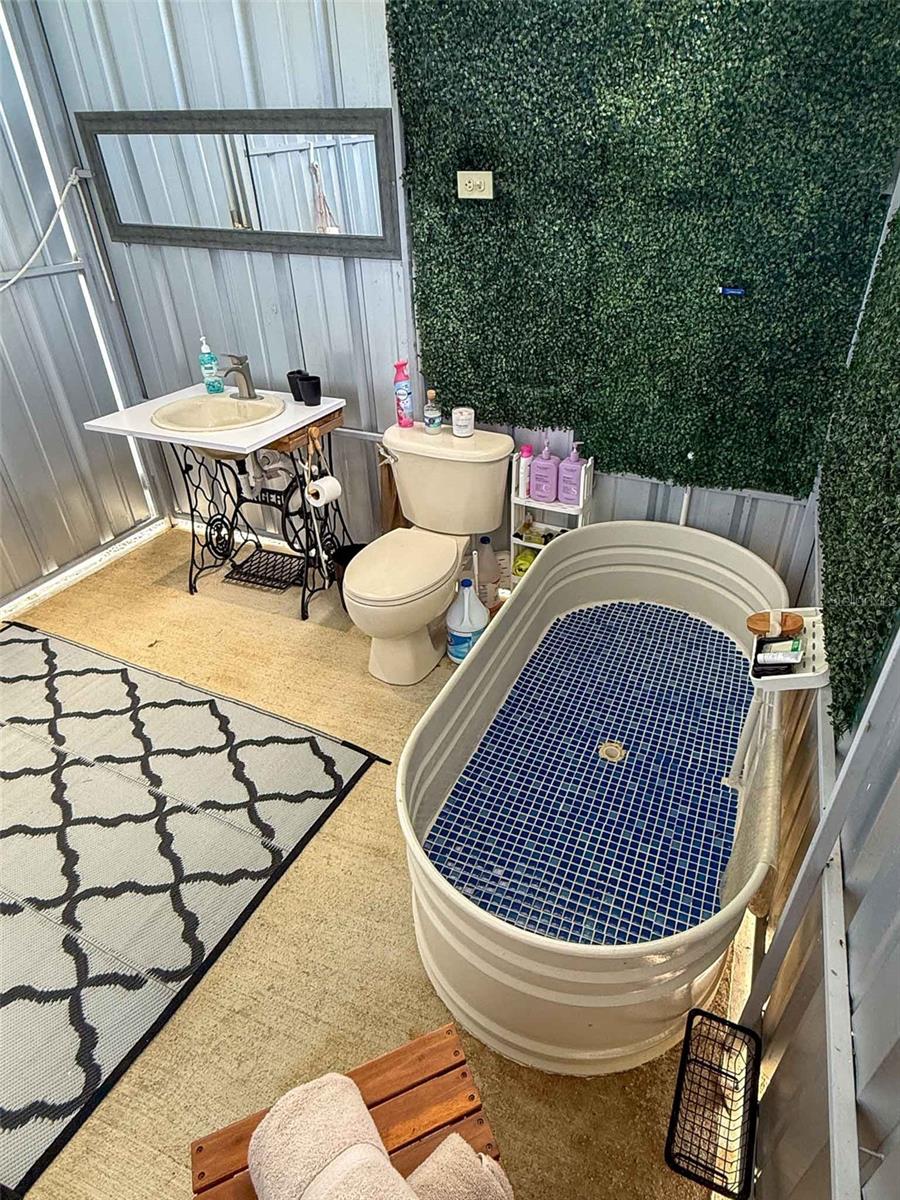 The third structure on the property contains a second full bathroom and a laundry area with washer and dryer. A deep metal soaking tub adds charm to the space, while a second outdoor bathtub is tucked into a private corner of the property for evening stargazing or post-beach relaxation.