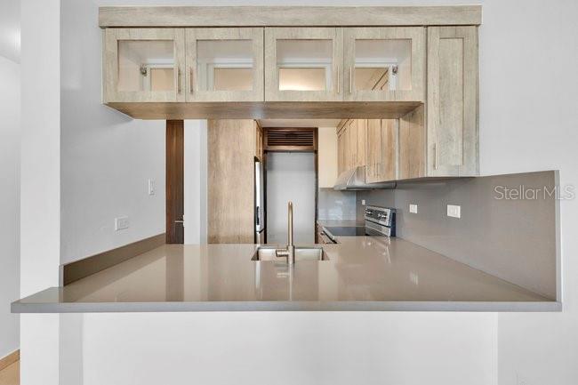 This recently renovated unit features custom-built PVC cabinetry with a stylish wall mirror, quartz countertops, and integrated electrical outlets in both bedrooms. The custom window shutters there eliminates the need for additional window treatments The kitchen boasts high-end appliances, including a refrigerator, electric stove with range hood, and dishwasher, all complemented by sleek PVC cabinets with quartz countertops and backsplash. The living room includes a six-foot entertainment center base, adding both function and style to the space.
