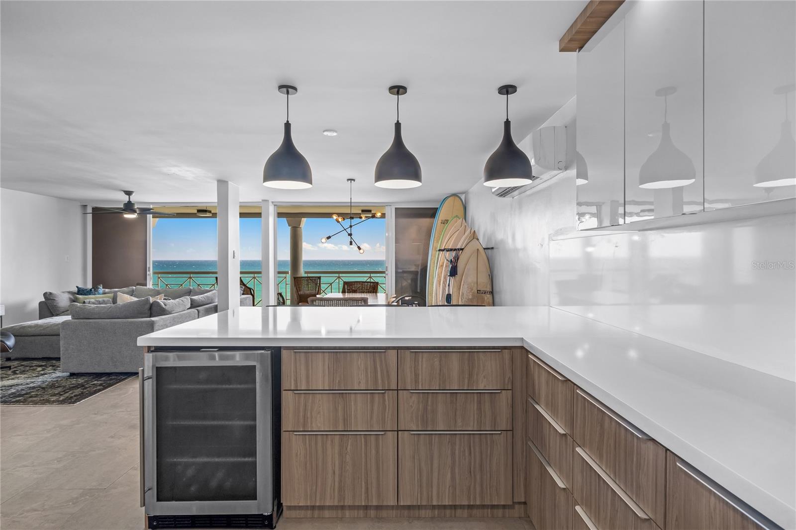 The gourmet kitchen stands as the heart of the home—expansive counter space stretches before you, offering room for culinary creativity or casual gatherings. High-end appliances integrate seamlessly with custom cabinetry, while the design ensures that even while cooking, you're never more than a glance away from that mesmerizing seascape.