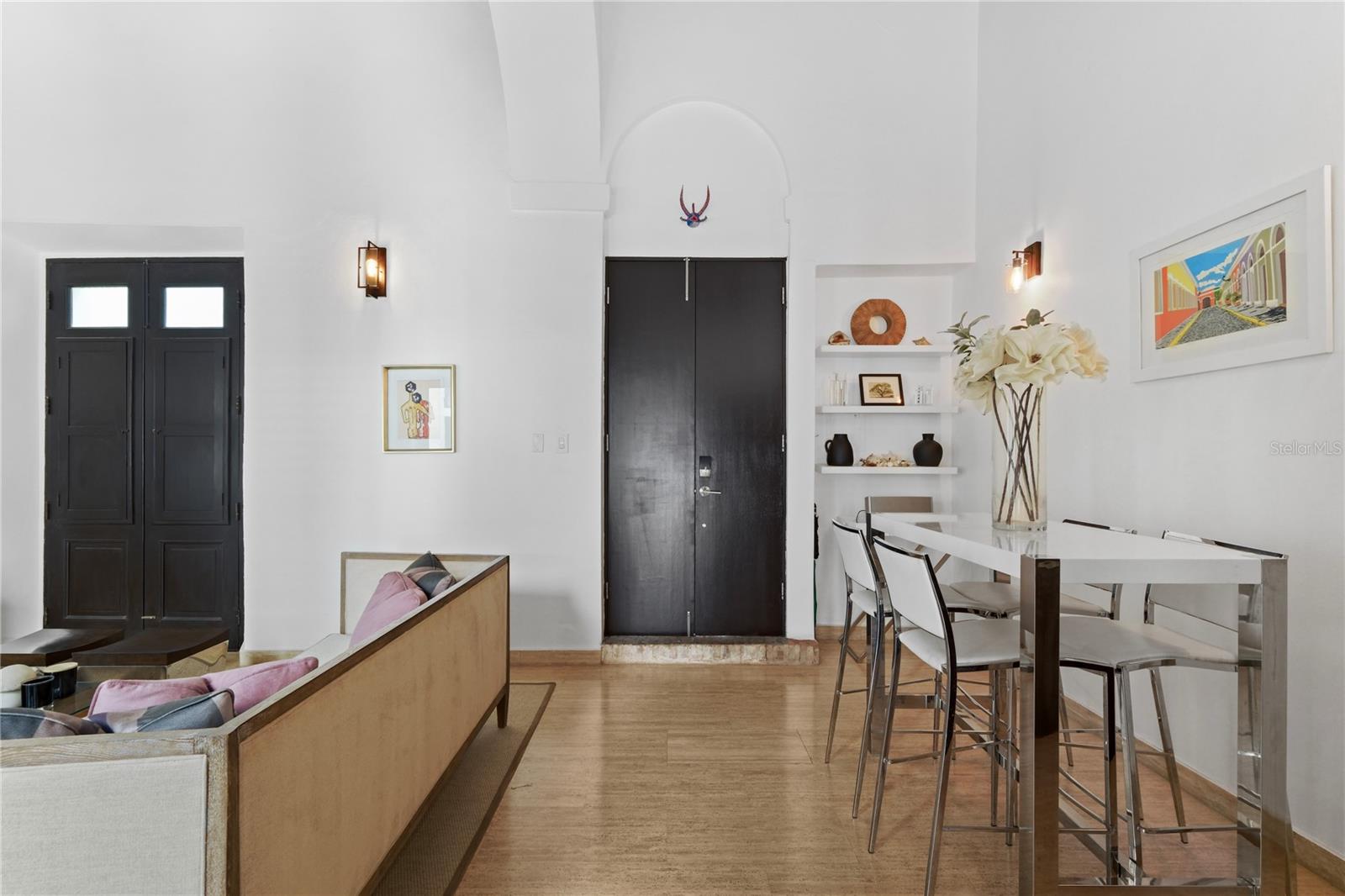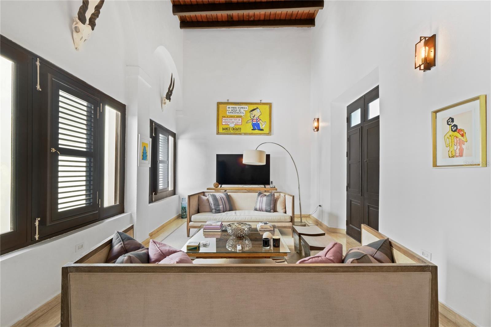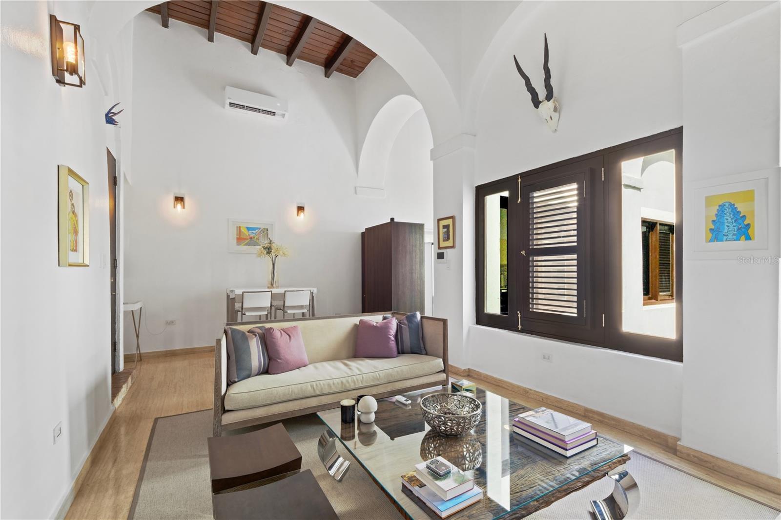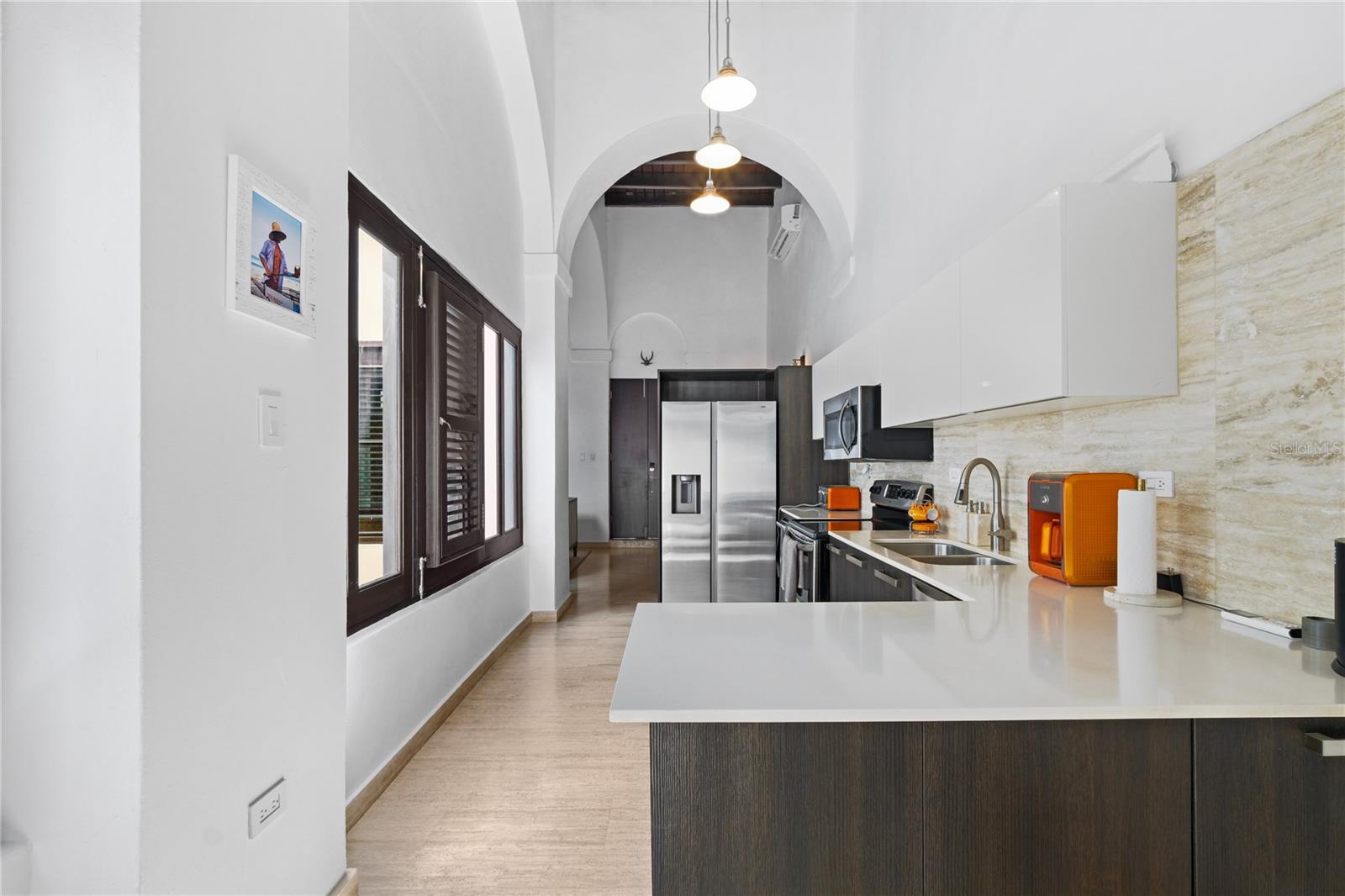 Live in the heart of Old San Juan in this beautifully designed and fully furnished second-floor apartment featuring soaring 17-foot ceilings that create a dramatic sense of space and light. Designed around an interior patio with expansive glass windows, the home is filled with natural light throughout the day, while original Spanish architectural details such as elegant arches blend seamlessly with an open floor plan for a unique and timeless design. The residence is finished with travertine stone floors, a European-style kitchen with modern appliances, and a built-in wine bar refrigerator, offering both comfort and sophistication. Quietly tucked away yet only half a block from Plaza de Armas, residents can enjoy immediate access to shops, cafés, restaurants, and even a SuperMax grocery store, making everyday living convenient and enjoyable. The apartment comes fully furnished for easy move-in, providing a stylish and functional space ideal for city living. Whether you’re seeking a private retreat, a home base while working remotely, or simply want to experience the history and charm of Old San Juan in comfort, this rare rental offers the perfect combination of historic character and modern amenities.