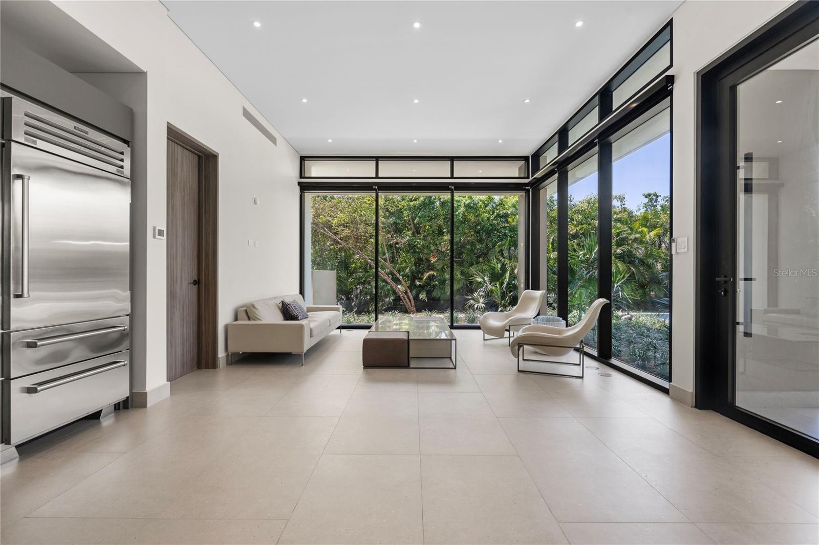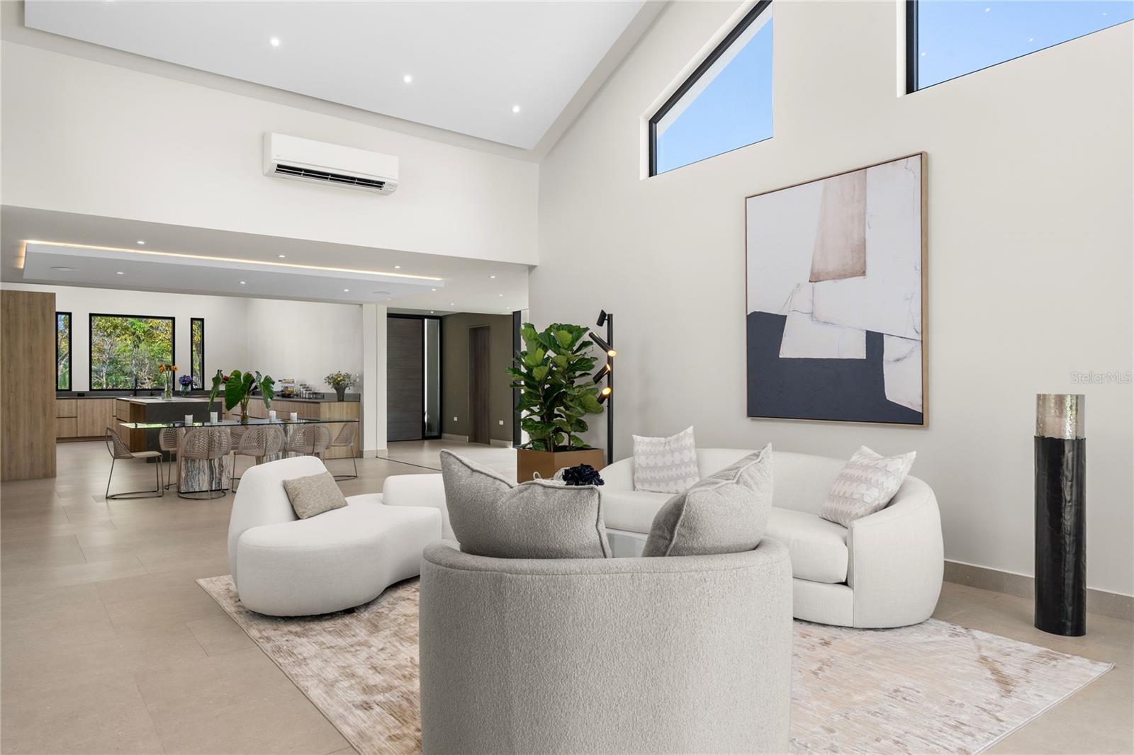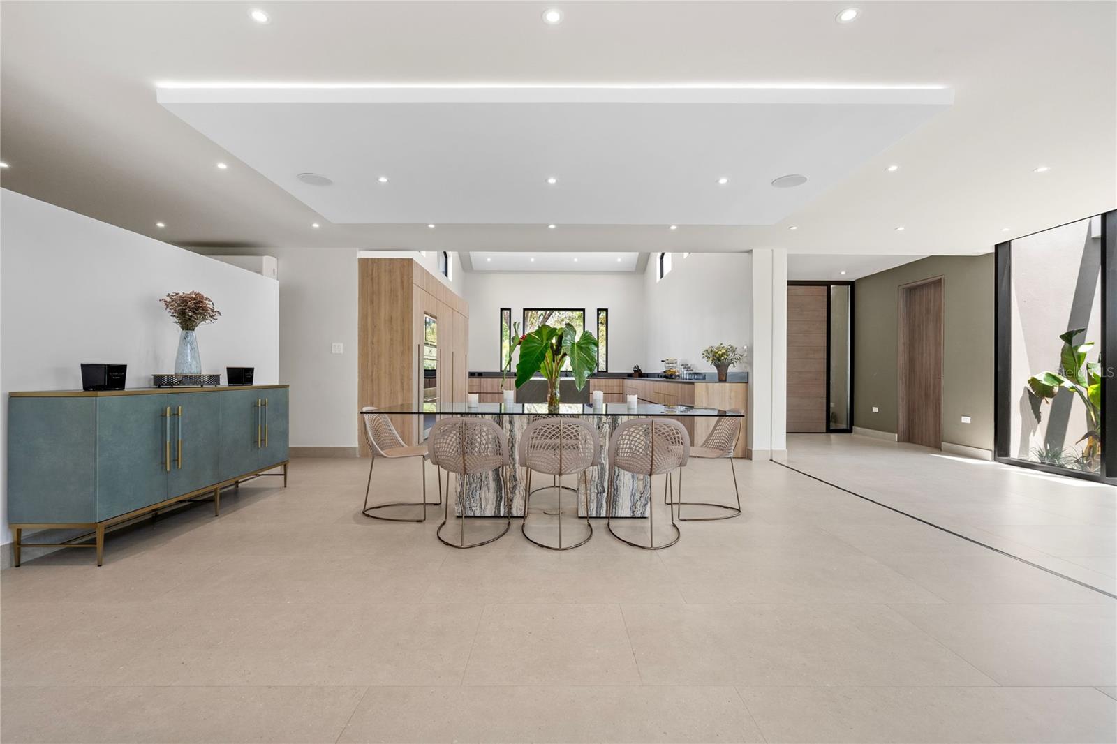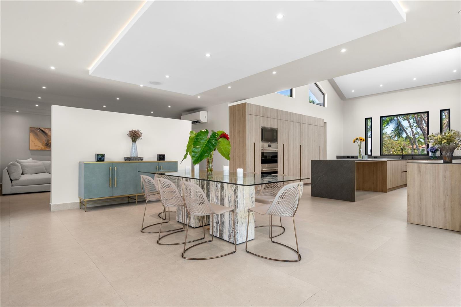 As you enter, you’re greeted by an expansive foyer leading to an open-concept living area, accentuated by soaring vaulted ceilings and magnificent floor-to-ceiling windows that bathe the space in natural light. The elegant living room flows seamlessly into a state-of-the-art gourmet kitchen, complete with high-end built-in appliances, custom cabinetry, and a generously sized island that serves as both a centerpiece for culinary creations and a perfect gathering spot for family and friends. This kitchen is a chef’s dream, designed for both functionality and flair.