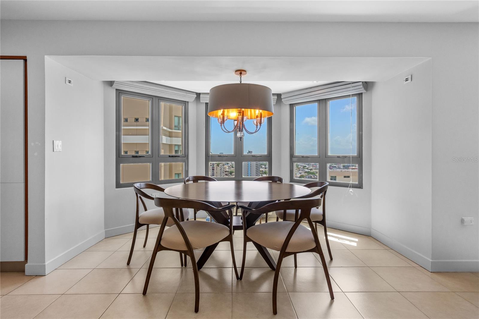 The living and dining areas are anchored by a remodeled kitchen featuring rich wooden cabinetry, granite countertops, and brand-new appliances. Large windows flood the space with light and frame panoramic views that extend across San Juan and out to the Atlantic.