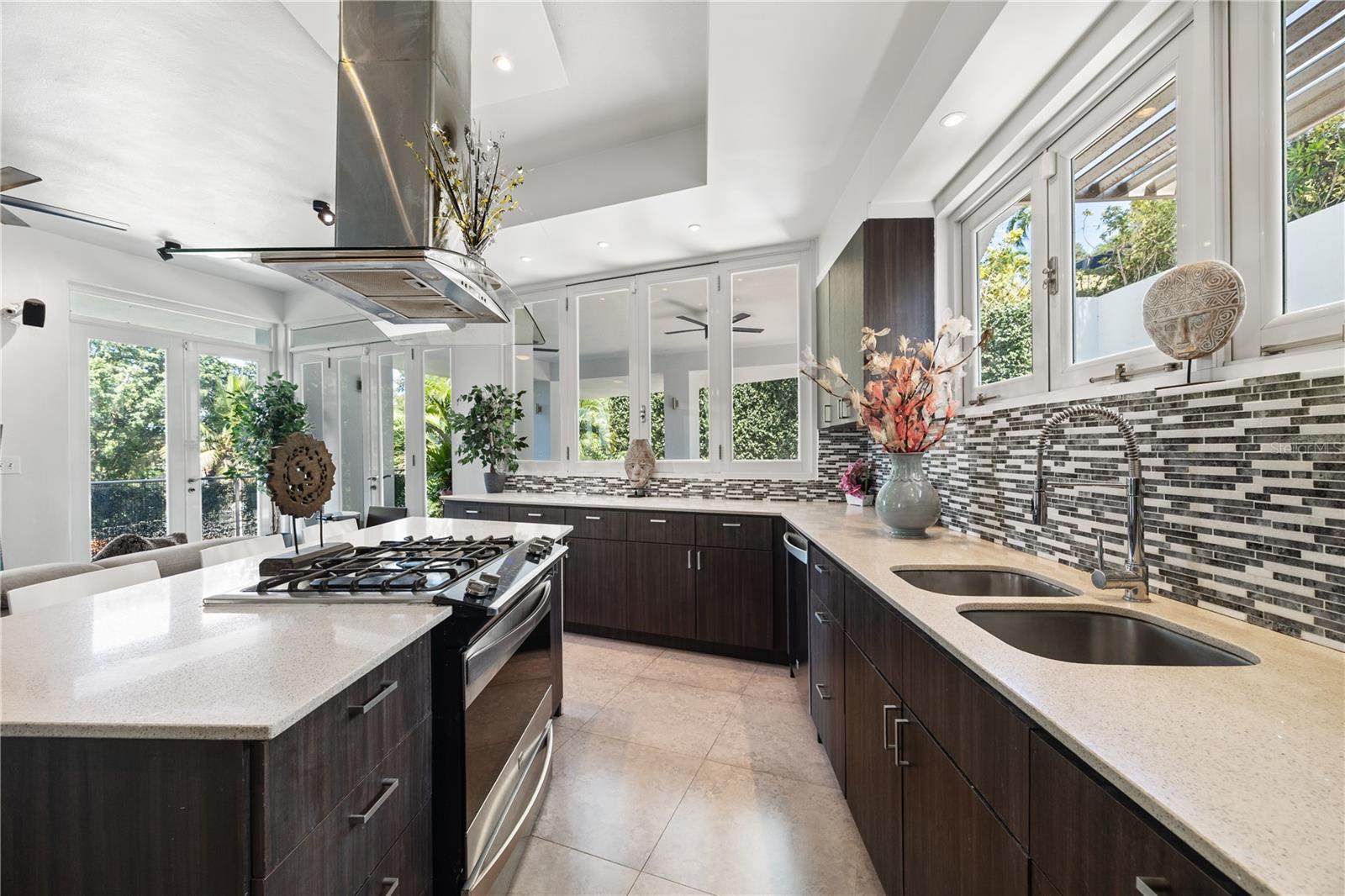 The primary suite features dual walk-in closets and a spa-style bathroom with a jacuzzi tub. A gourmet kitchen anchors the main level, complemented by a secondary kitchenette upstairs for added convenience when entertaining or hosting guests.