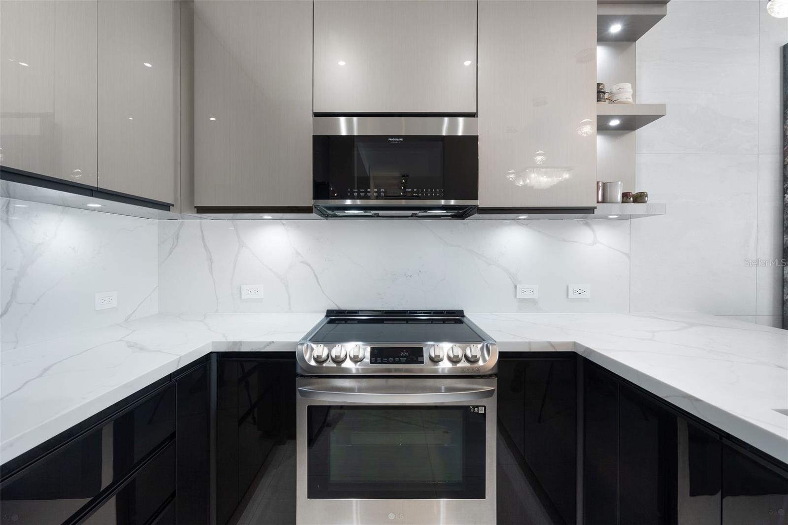 Inside, you'll find large-format porcelain tile floors with commercial-grade epoxy grout, recessed tile baseboards with a modern shadow line design, premium Level-5 drywall finishes, and walls coated in Benjamin Moore Aura paint. All doors are solid wood with custom hardware and a marine-grade varnish finish. The open kitchen features Calacatta Mystic quartz counters with waterfall edges and full backsplash, custom acrylic cabinetry, and a layout designed for entertaining.