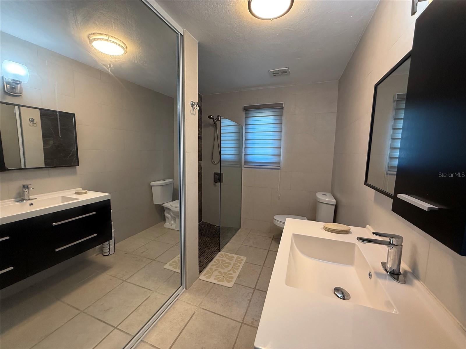 On the second level, the main living quarters open into a bright, open-concept floor plan that seamlessly connects the living room, dining area, and kitchen. Expansive glass doors lead to a balcony overlooking partial views of the beach and the El Yunque mountains, creating a perfect indoor-outdoor flow. This level also includes a half bathroom and access to a beautiful private pool with cascading waterfall—ideal for entertaining and relaxation.