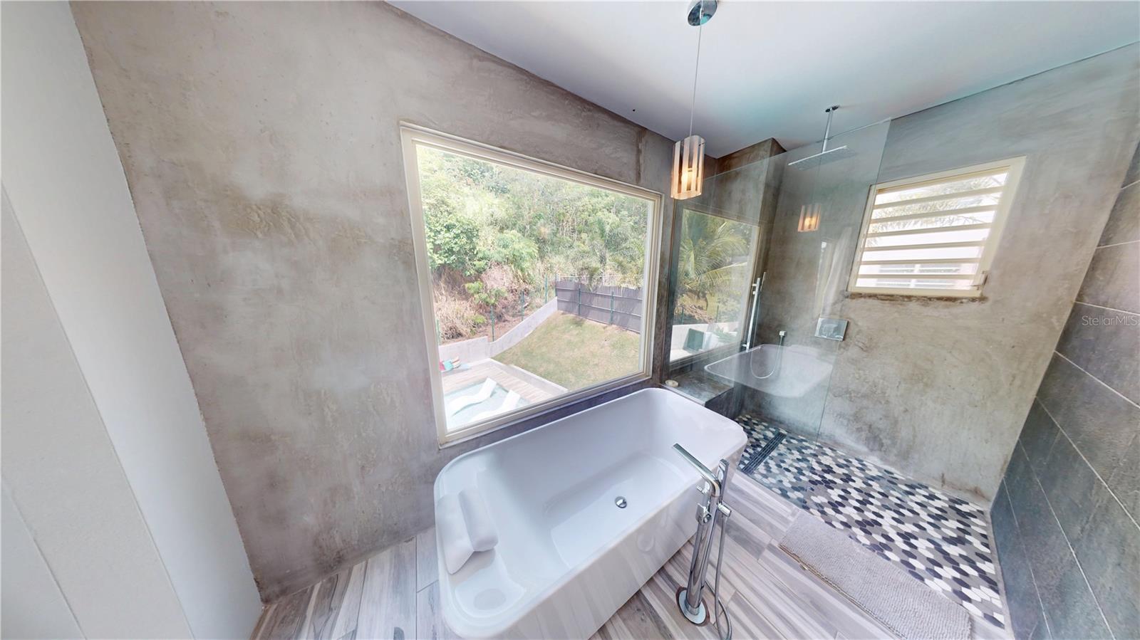 A beautiful staircase with panoramic window leads to the upper atrium, where the laundry room and four bedrooms are located, including two master suites with walk-in closets and luxurious bathrooms with dual sinks, showers, and soaking tubs. One master features a balcony with mountain views, while the second includes a private exercise area and large windows overlooking the pool, offering a serene, resort-style awakening.