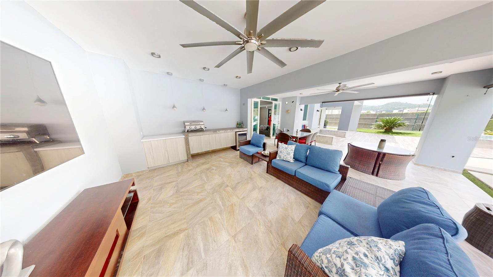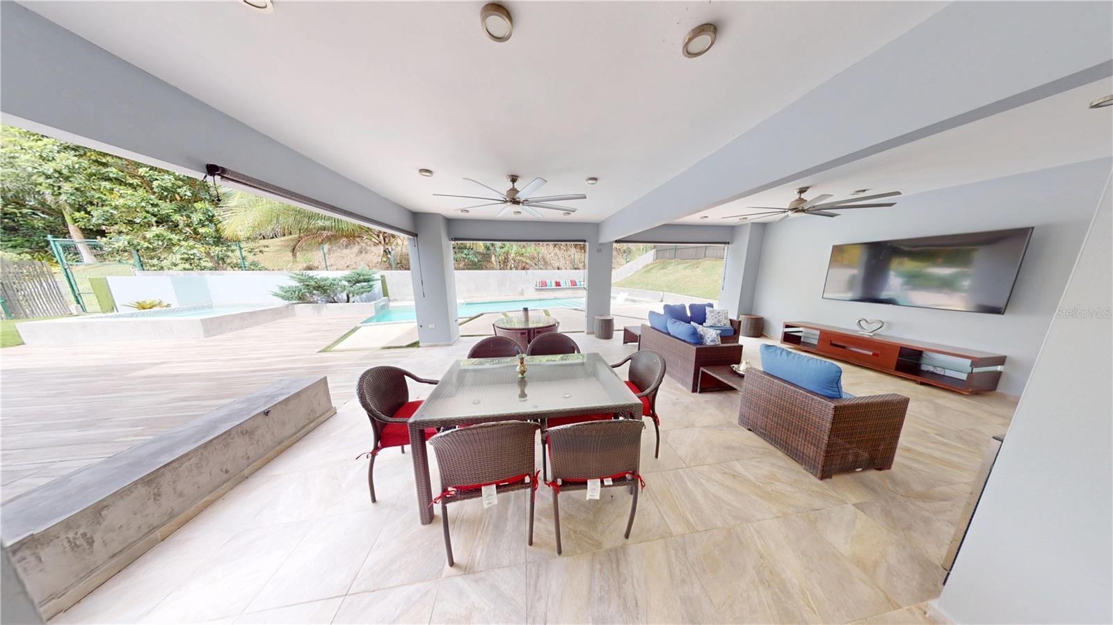 The family room opens to an extraordinary outdoor area with gardens, covered terrace, and an open-air terrace ideal for sunbathing or stargazing. The backyard provides a resort-like experience with swimming pool, jacuzzi, and full bathroom, surrounded by greenery and no rear neighbors, ensuring privacy and mountain views.