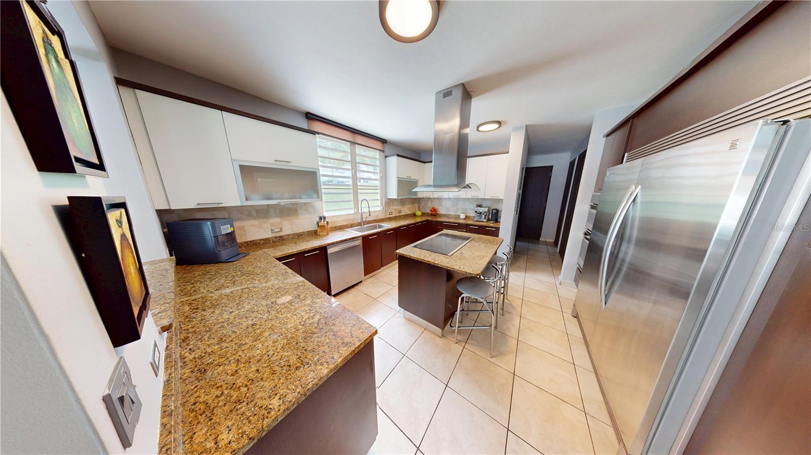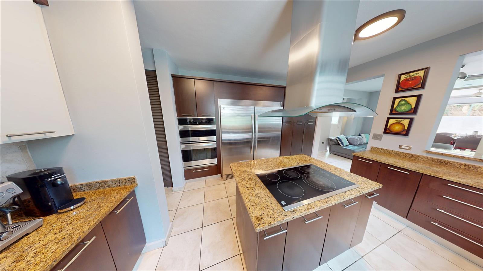 The gourmet kitchen includes granite countertops, center island, breakfast bar, dishwasher, food disposer, oven–microwave combo, cooktop, Sub-Zero refrigerator, and pantry, plus a window overlooking the private basketball court. Designed for both style and functionality, perfect for cooking and entertaining.