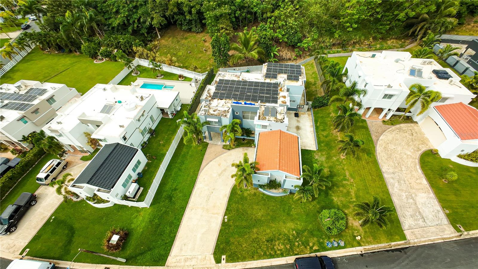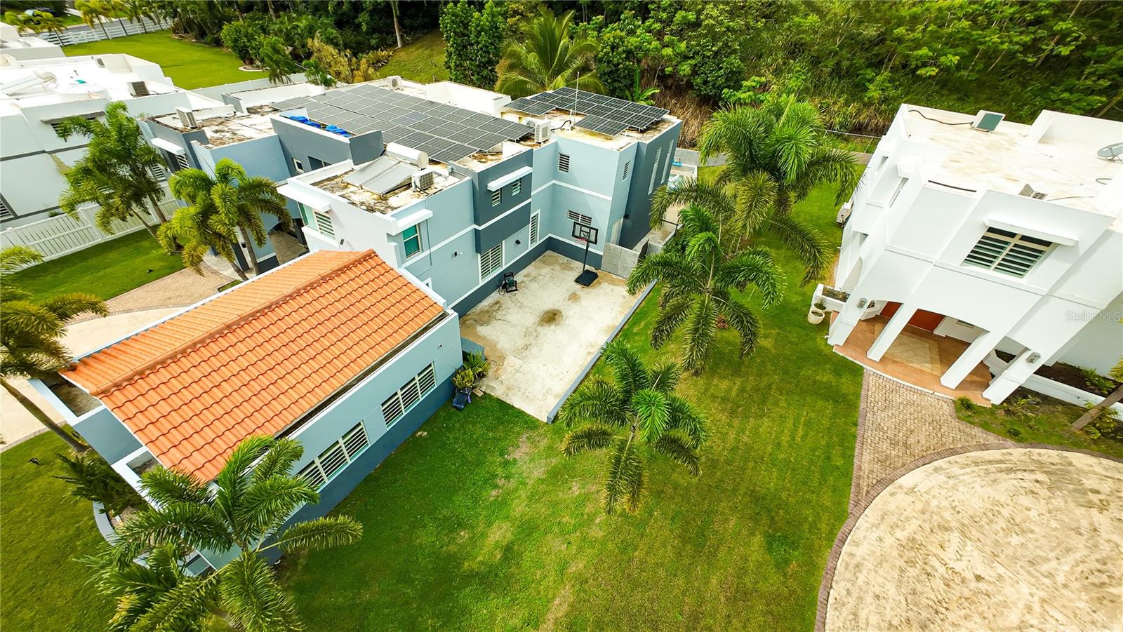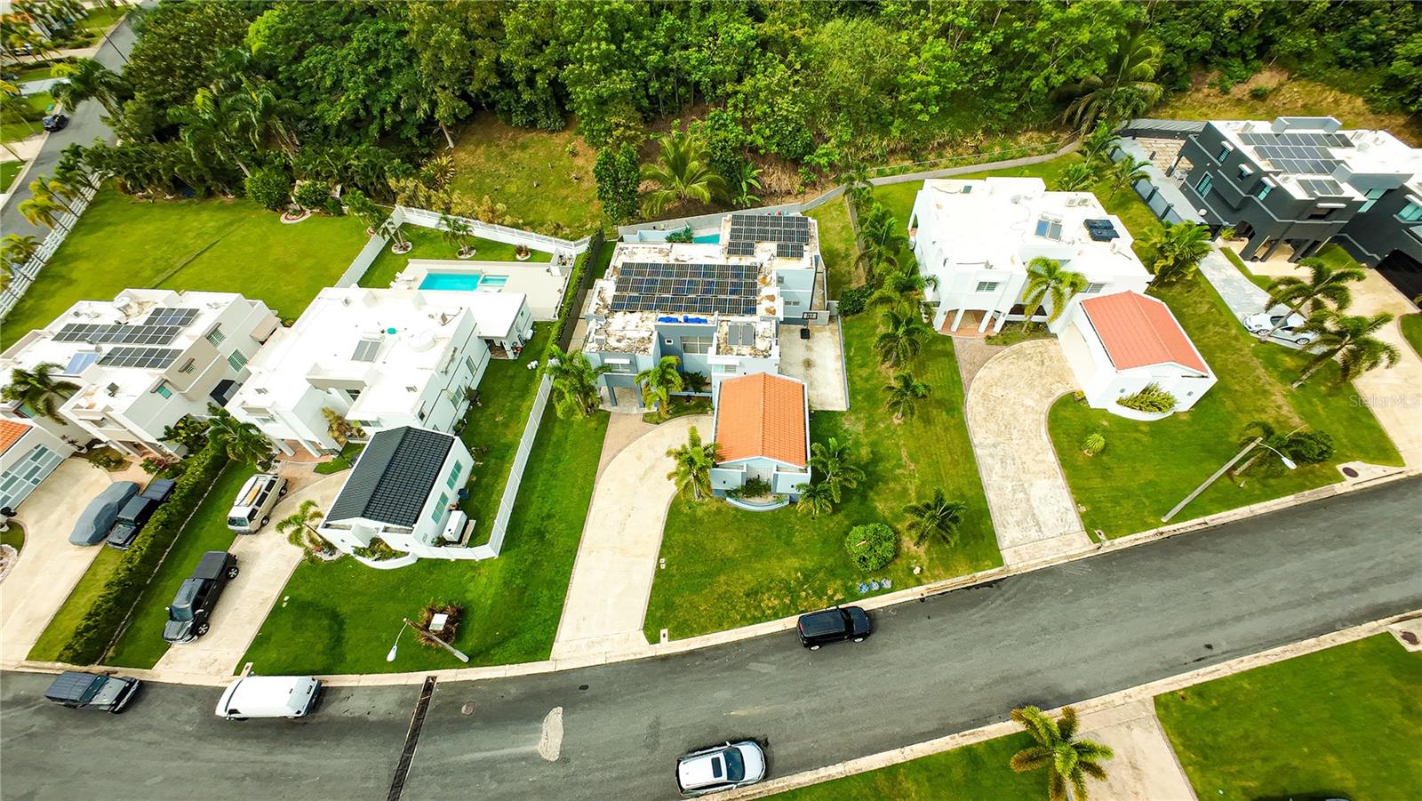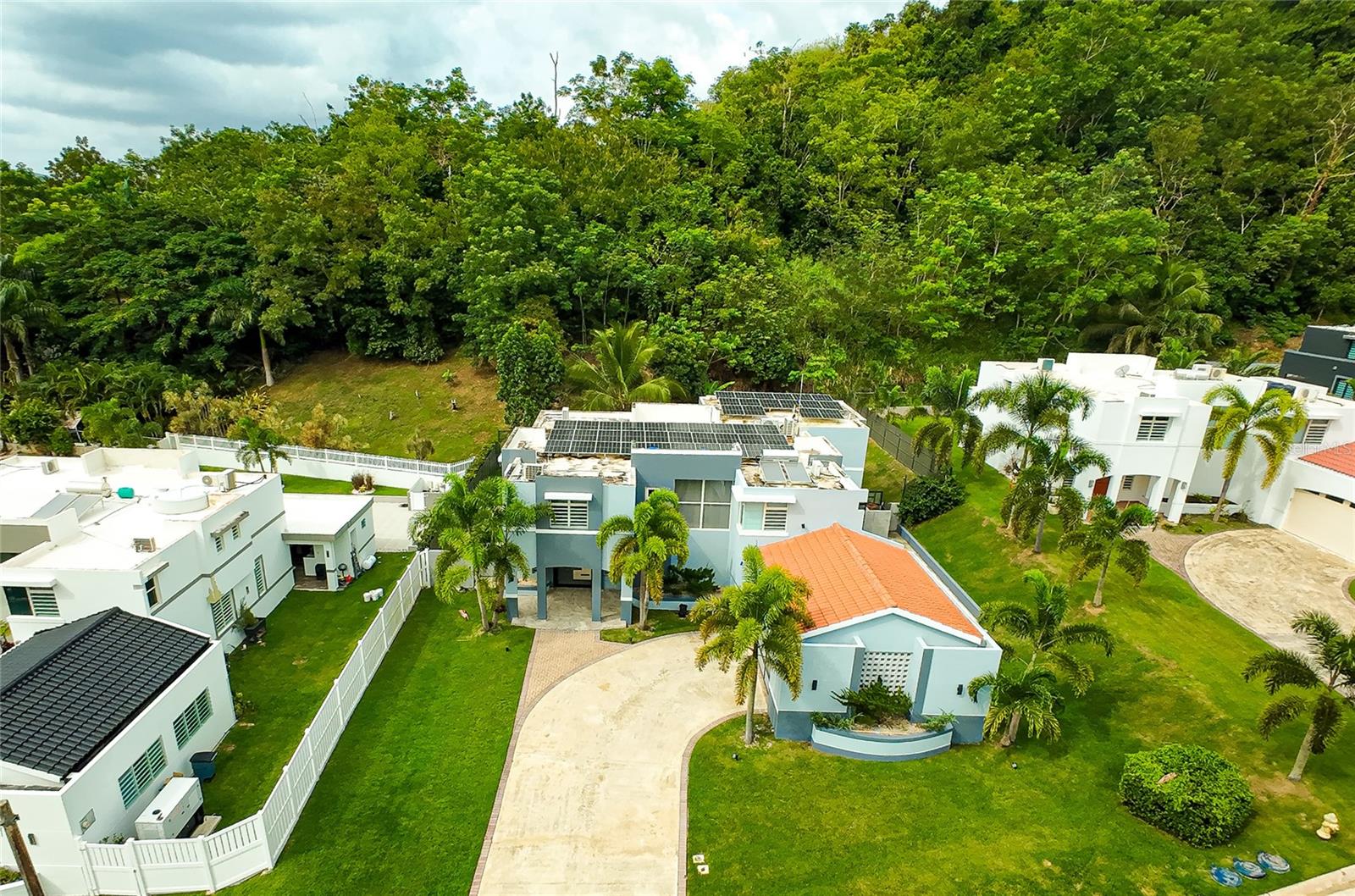 Additional features include a two-car garage, six mini-split A/C units, five ceiling fans, water cistern, solar panel system with four batteries, gas generator, solar and electric water heaters, security cameras, and high-speed Aeronet Internet.