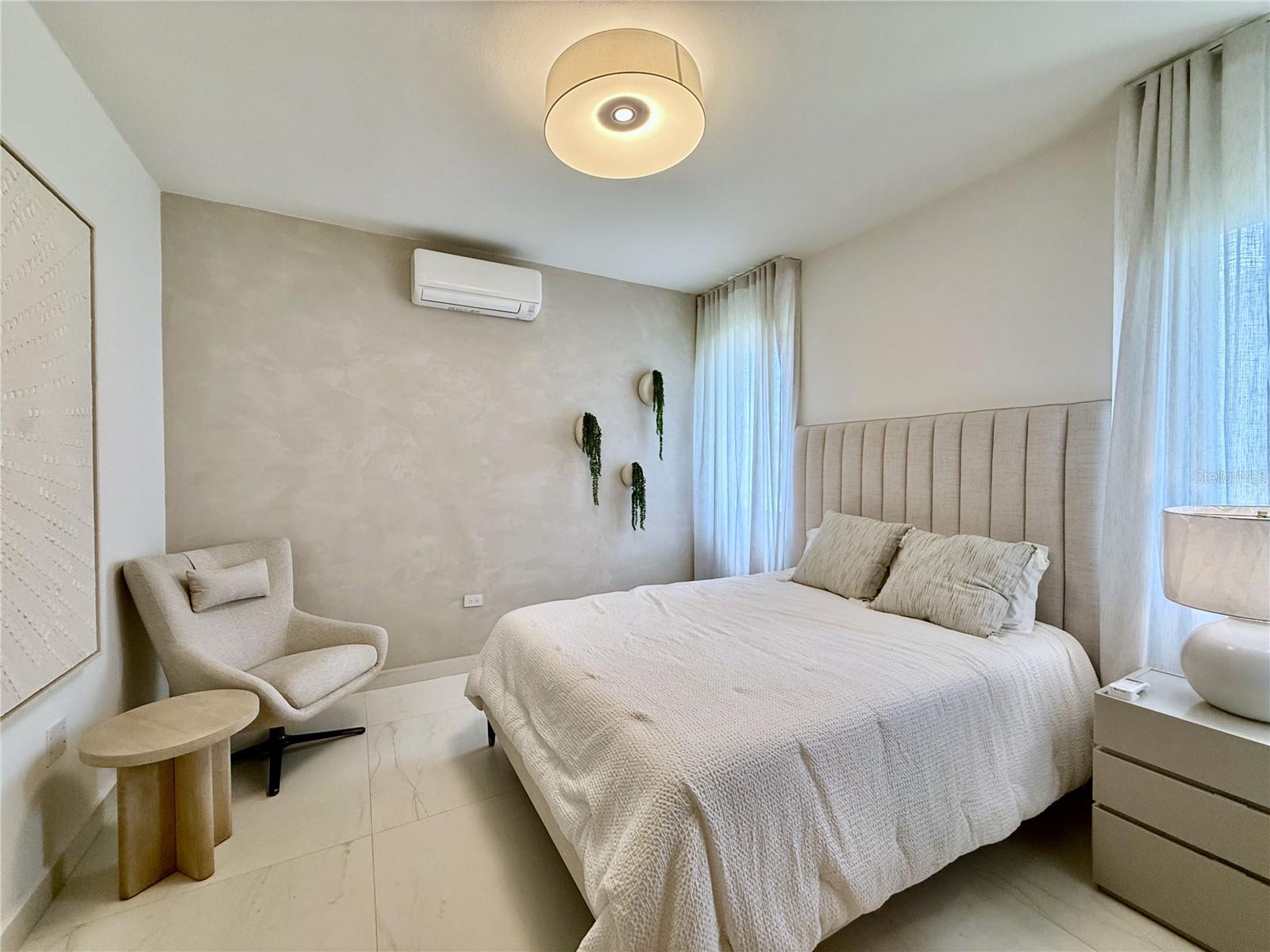 The master suite offers a luxurious ensuite bath and a custom his-and-hers California Closet. Additional features include split-unit A/C, solar water heater, and an electric car charger. Outdoor living is enhanced by a covered high-ceiling terrace, lush landscaping, and stunning sunsets.