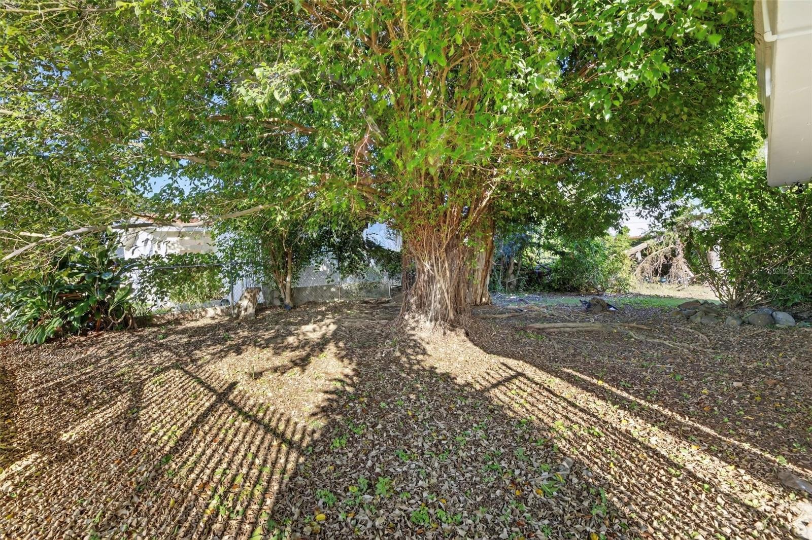 The large backyard shaded by mature trees offers a fresh and private atmosphere — ideal for creating a terrace, pool, BBQ area, or home garden.