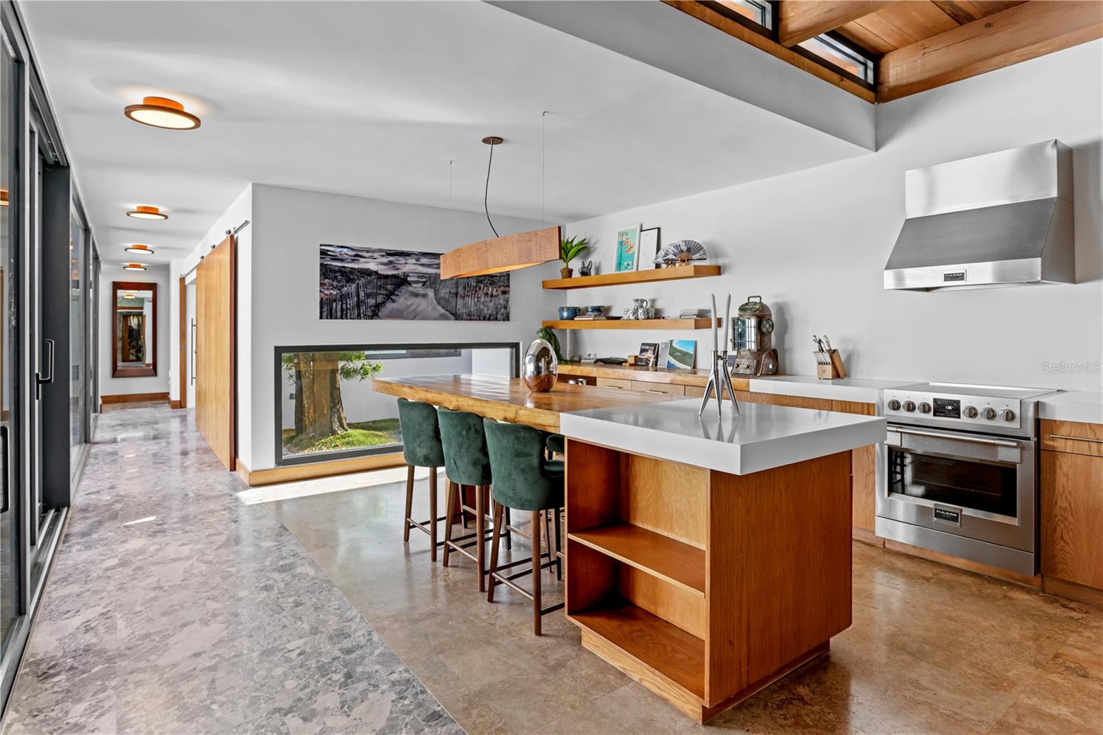 Bathed in natural light from above and below, the home features distinctive skylights and floor level windows that accentuate its open, organic feel. Locally sourced wood accents, natural stone floors, and textured exterior walls echo the harmony between nature and architecture.