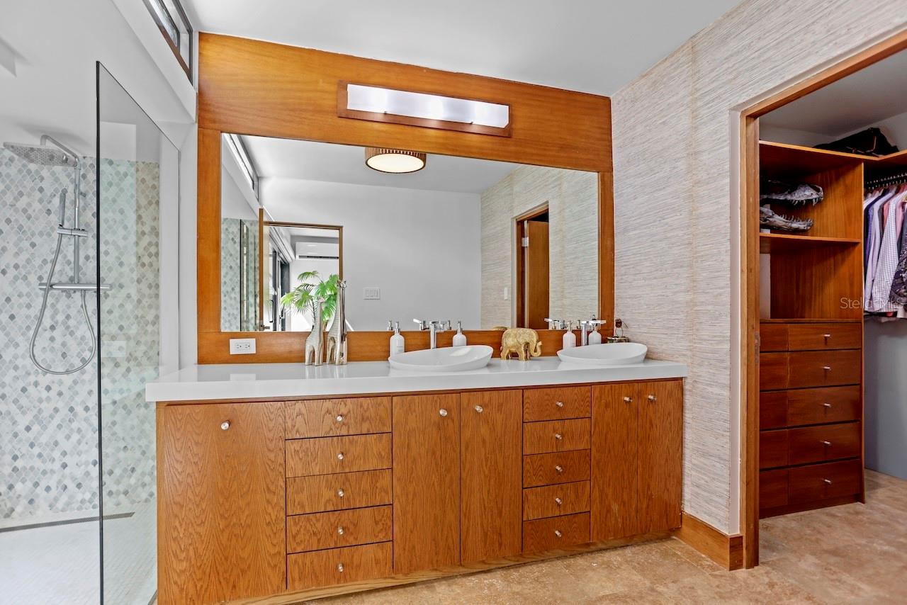 The master suite features dual walk in closets, dual vanities, and dual rainfall showers. A guest bedroom with both interior and exterior access adds privacy and flexibility, while a third bedroom doubles as an office with a built in queen sized Murphy’s bed and generous storage.