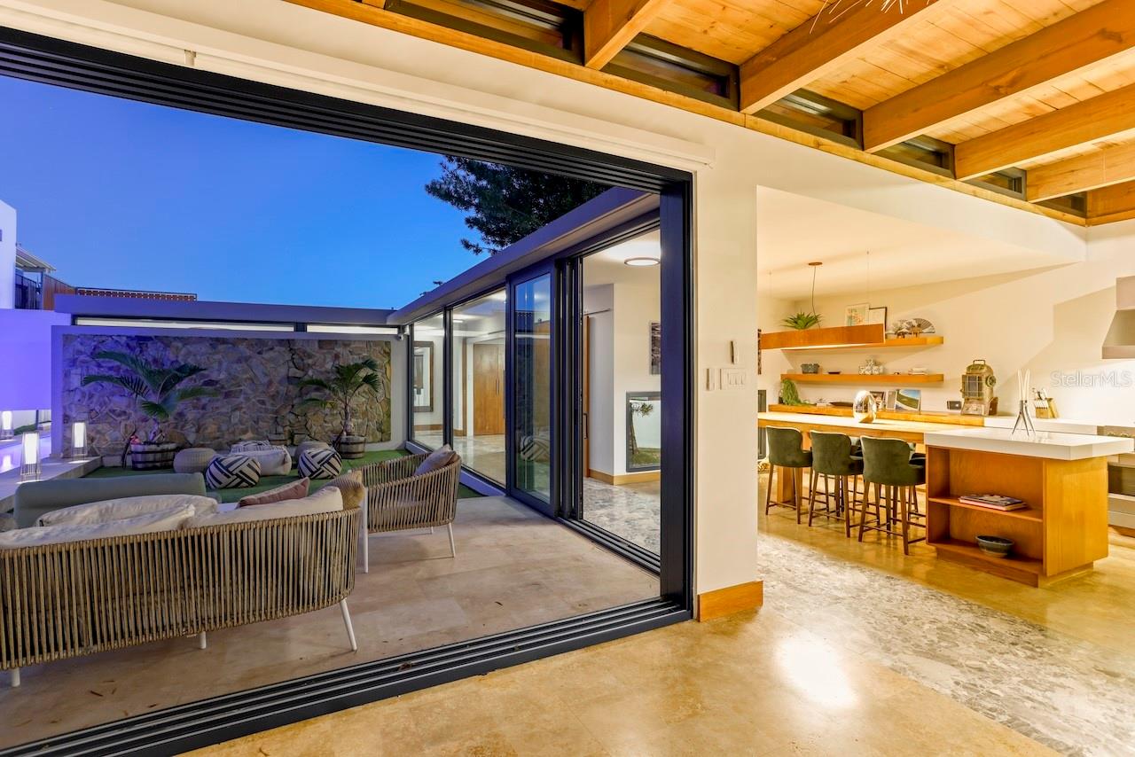 Multiple entry points are equipped with state of the art biometric access systems including fingerprint, passcode, facial recognition, and smartphone connectivity. Inside, no detail has been spared: Fulgor Milano kitchen appliances, light quartz countertops, elegant wallpaper finishes, designer sinks, reverse osmosis drinking water system plus whole-home water filtration, remote controlled blackout curtains in all bedrooms and living room, Midea air conditioning systems and Ring security cameras operable from anywhere in the world, and custom wood lighting throughout including a floating canoe light in the dining area paying tribute to Puerto Rico’s cultural heritage.