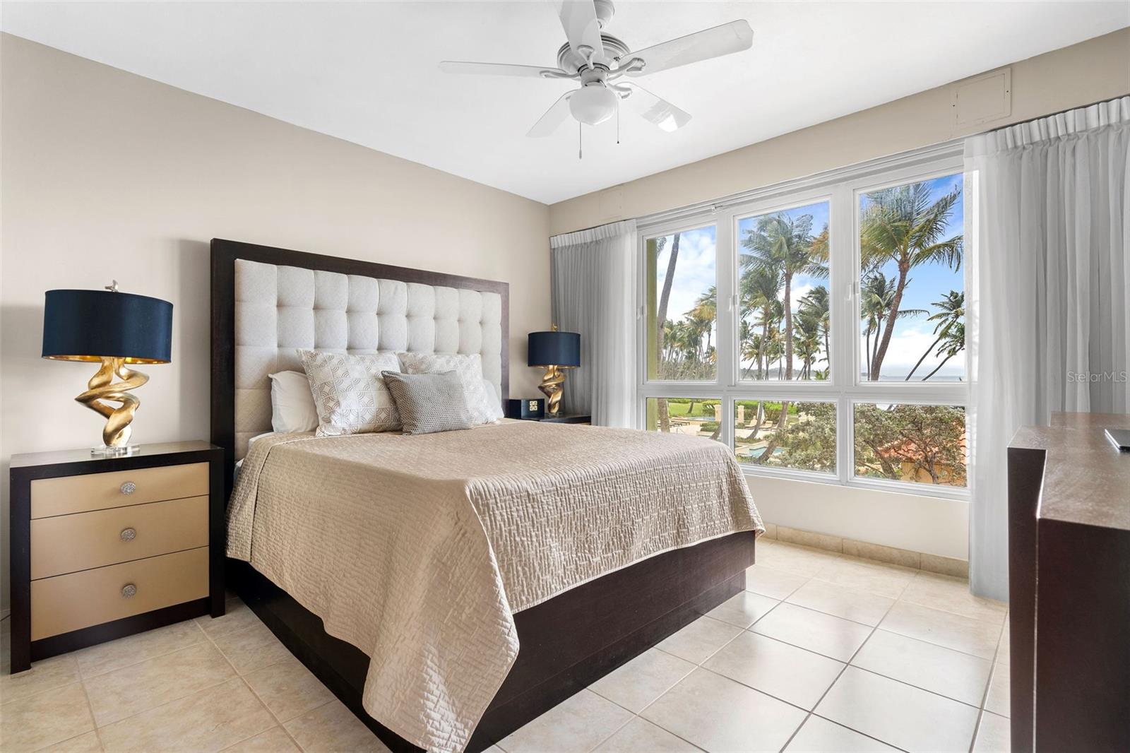 The spacious primary suite offers panoramic sea vistas, a luxurious ensuite bathroom with double sinks, a separate shower, a jacuzzi tub, and a walk-in closet. The second bedroom includes a private entrance, full bathroom, walk-in closet, and kitchenette—perfect for guests or short-term rental use.