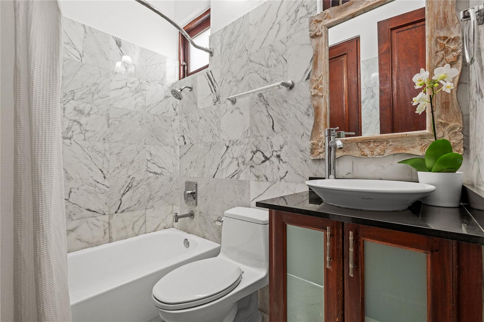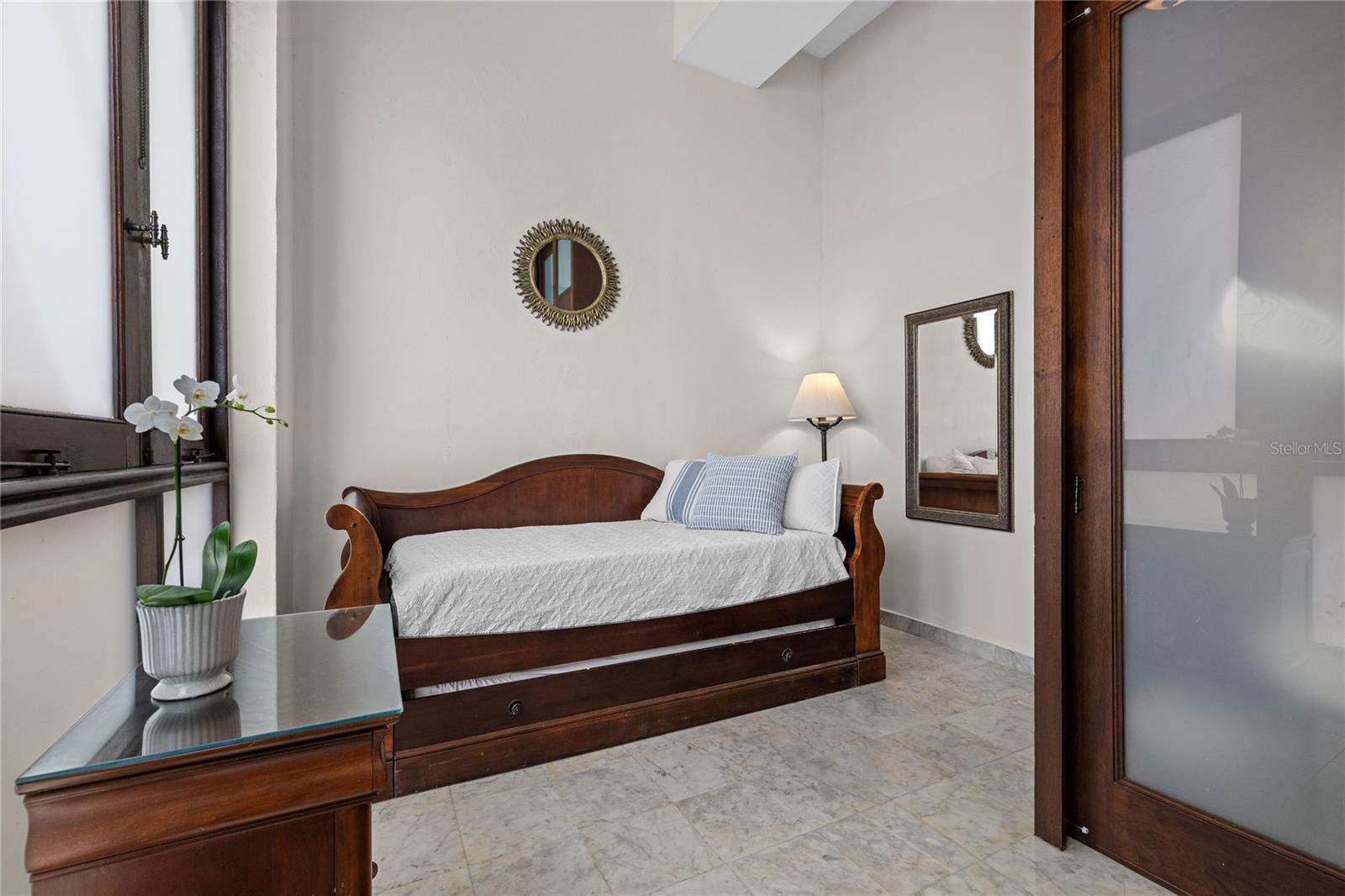 Located on the second floor of a beautifully restored four-level building on Calle Sol, this apartment embodies the history and refinement that defines Old San Juan. The structure, dating from the early 20th century, underwent a complete restoration around 2005, preserving its original architectural character—stained glass transoms, ornate ironwork, high ceilings, and classic hydraulic tile floors in the common areas—while incorporating thoughtful modernizations. Among them: a discreet, full-sized elevator, a rarity in the historic zone, and elegant interiors finished in white marble and black granite set in a timeless checkerboard pattern.